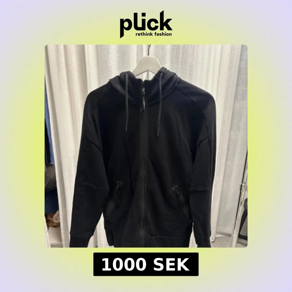 Svart hoodie från C.P. Company med hel dragkedja, två fickor med dragkedja och ikoniska goggles på huvan. Tröjan har snörning i huvan och är långärmad.