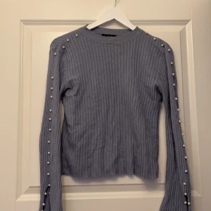 Fin tröja i ljusblå färg, med pärlor längst både ärmarna och slits i slutet på ärmen. Det saknas en pärla