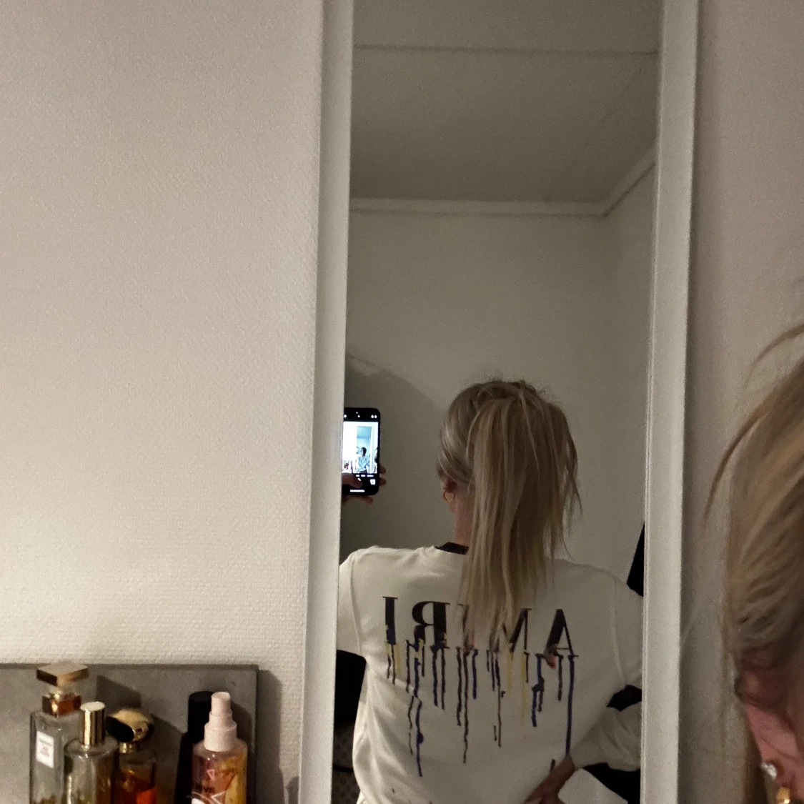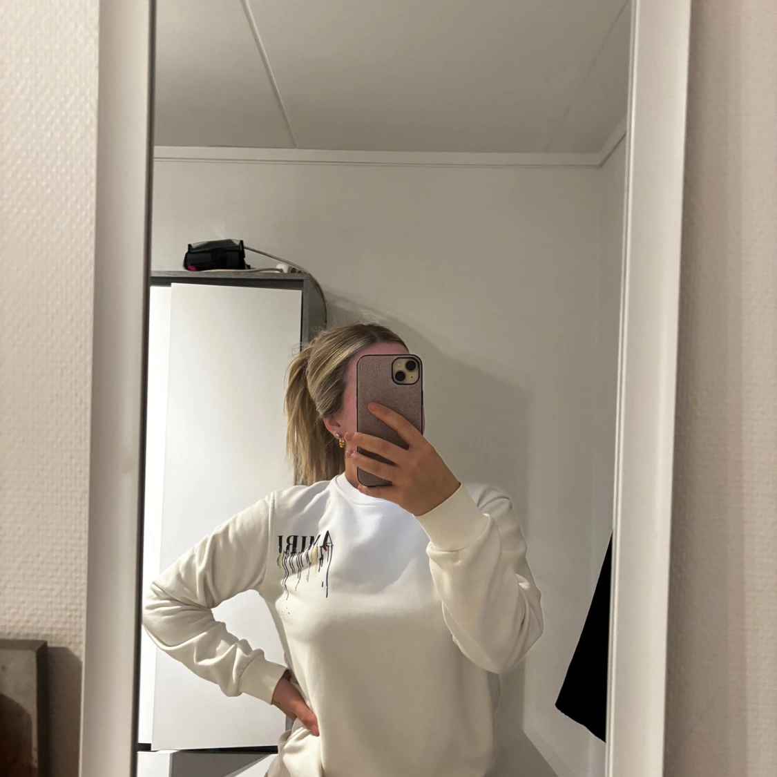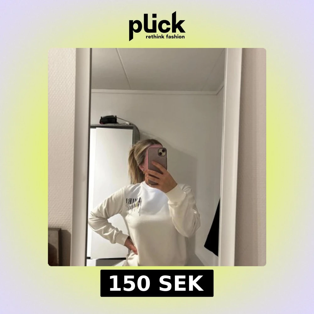 Säljer en vit långärmad tröja från Amiri med blått och lila på ryggen. Perfekt för en avslappnad stil. Tröjan har en normal passform och är tillverkad i ett mjukt material.