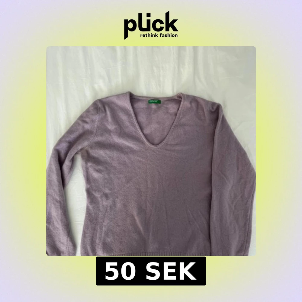 Säljer en stilren lila tröja från United Colors of Benetton. Tröjan har en v-ringad design och är långärmad. Har en fläck på sig. Passar mig som har storlek s