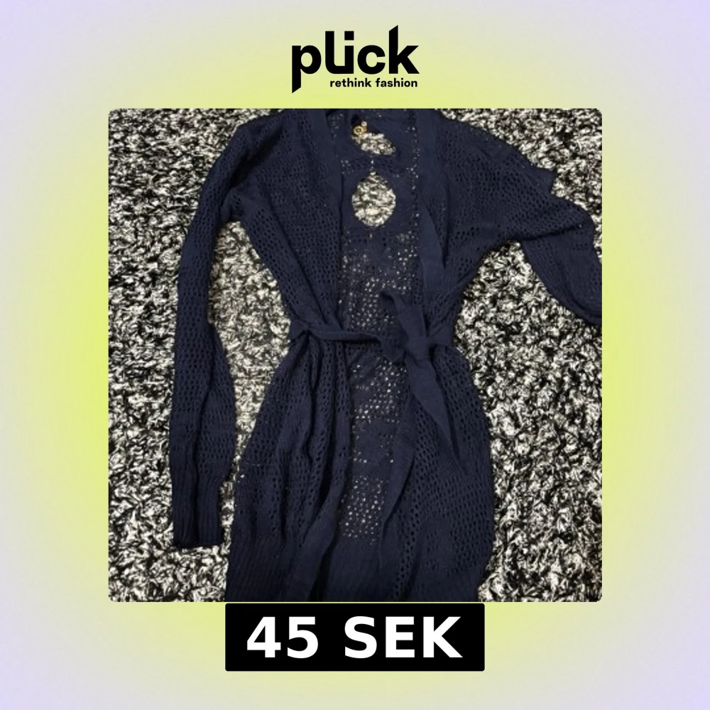Säljer en mörkblå, långärmad stickad kofta med knytband i midjan. Koftan har ett genomgående hålmönster och dekorativa detaljer framtill. Perfekt att slänga över en topp för en snygg lager-på-lager-look. Lite öppen i ryggen