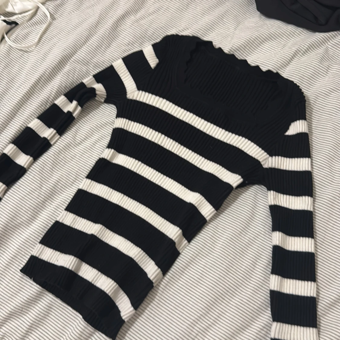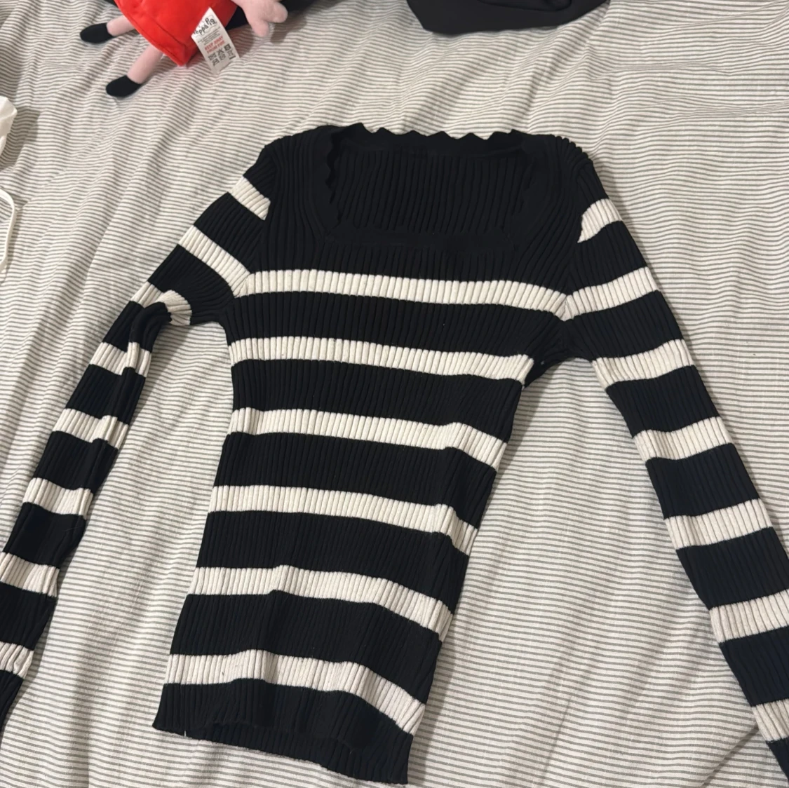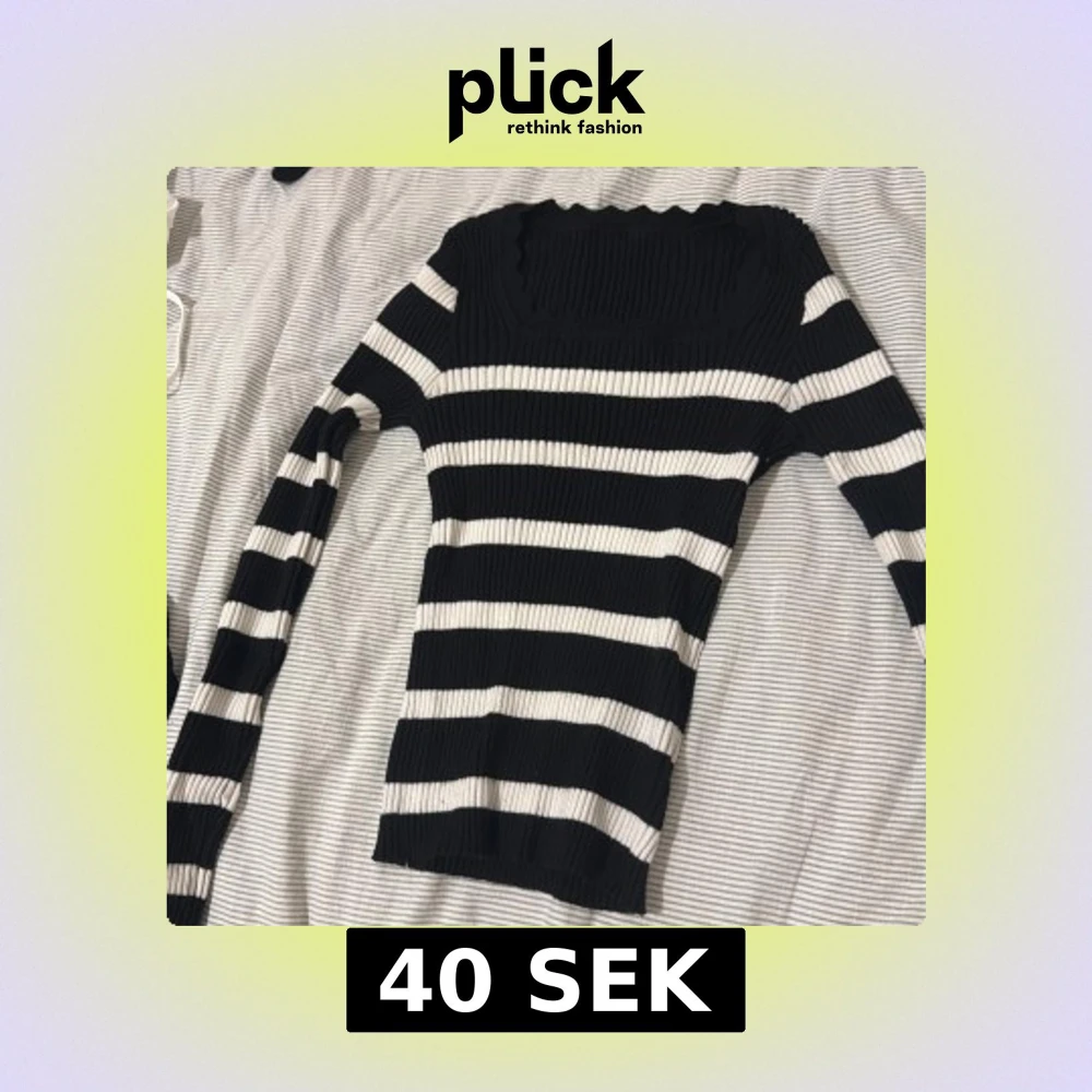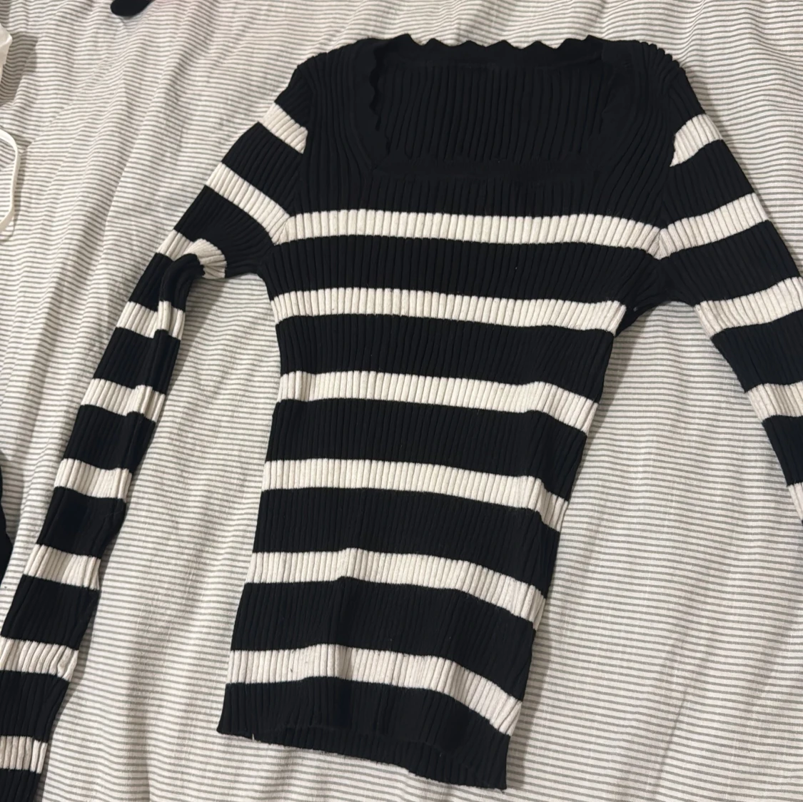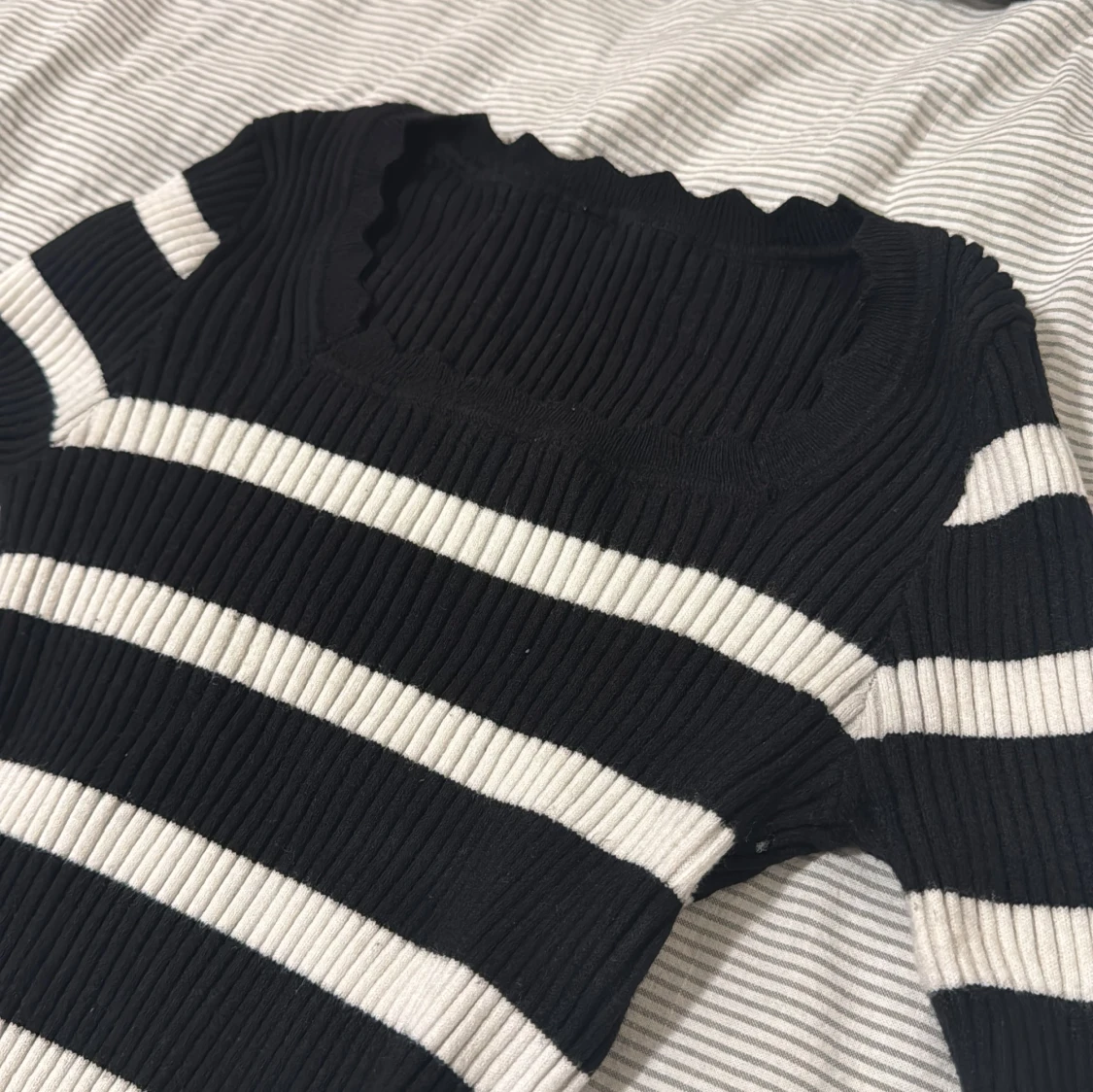 Säljer en svart och vit randig ribbad tröja med lång ärm och fyrkantig halsringning. Tröjan är tight i modellen och har en stretchig, stickad känsla. Perfekt för dig som gillar klassiska ränder och vill ha en stilren look.