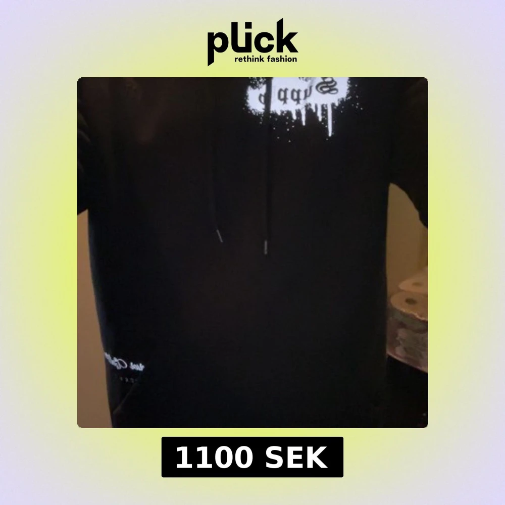 Svart hoodie med vit grafisk tryck på bröstet och snörning i huvan. Klassisk känguruficka framtill och bekväm passform. Perfekt för dig som gillar små detaljer på hoodien och vill ha en stilren look. Skick 9/10 använt den 2-3 gånger hör av er vid pris osv