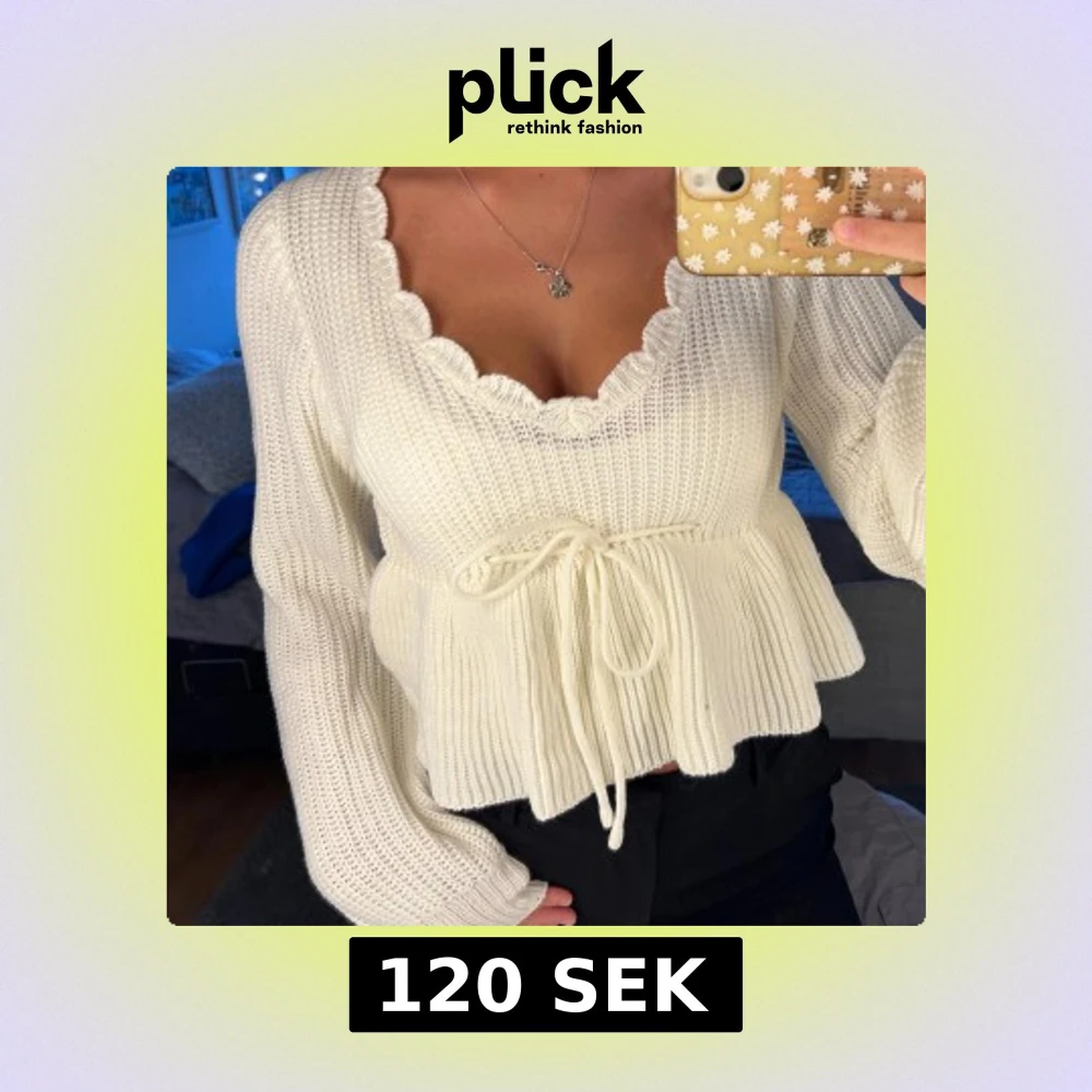 Charmig vit stickad tröja med volangdetaljer och knytband i midjan. Tröjan har en v-ringad hals och långa armar.