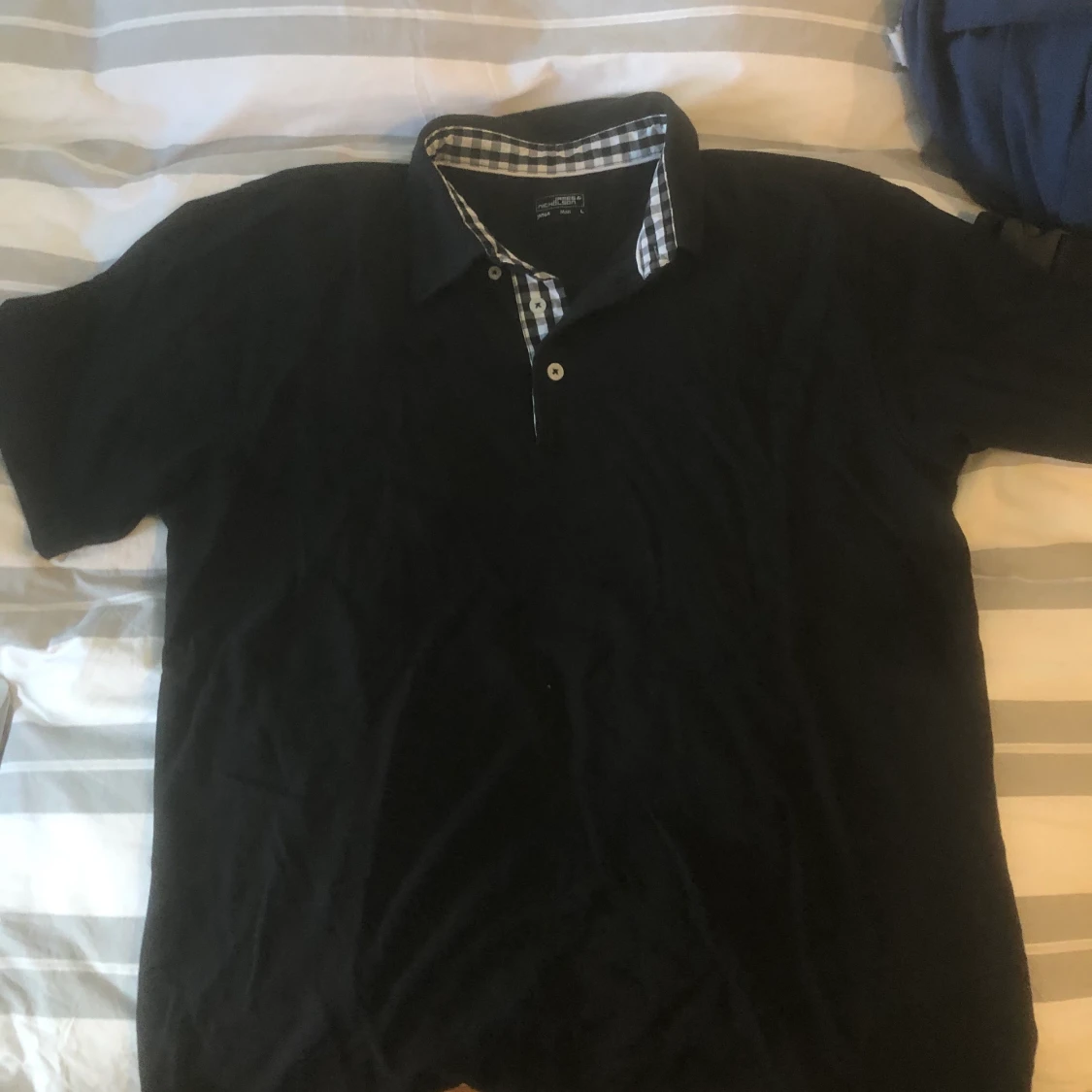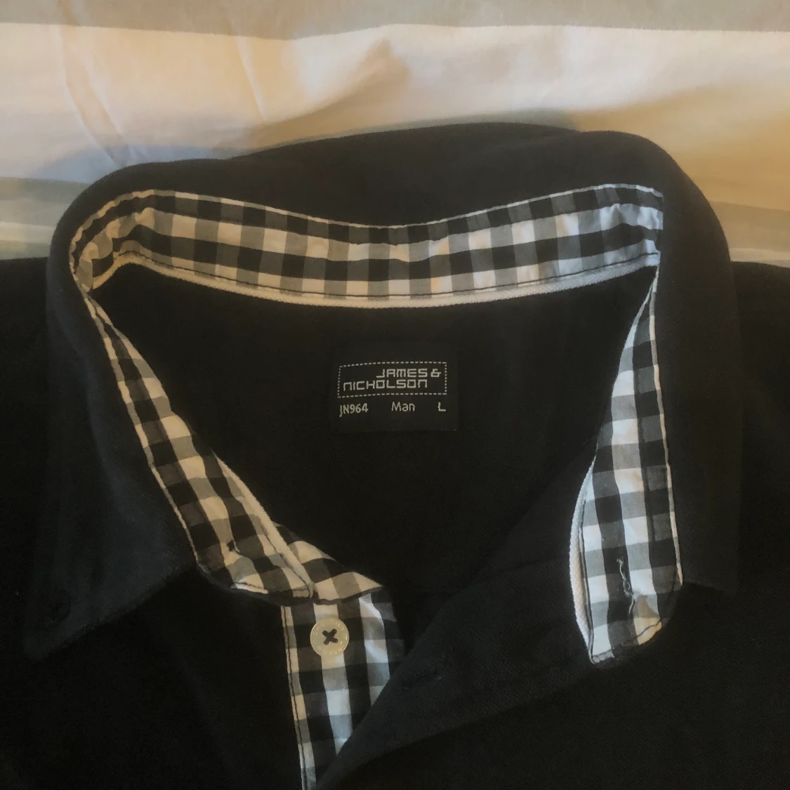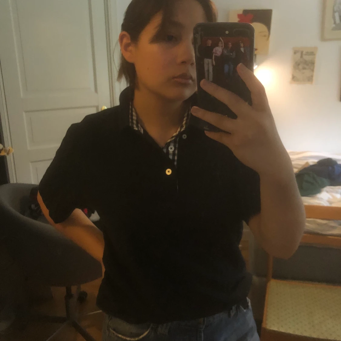 Svart pikétröja med lite svart vit rutigt i kragen, super charmigt, säljer pga används för lite. Passar mig som är en S/M.