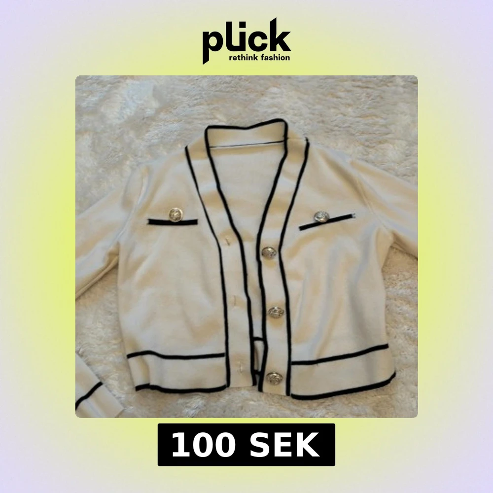 Snygg vit kofta från SHEIN med svarta kantdetaljer och dekorativa guldfärgade knappar framtill och vid fickorna. Koftan är croppad, har lång ärm och är gjord i mjukt stickat material. Helt oanvänd
