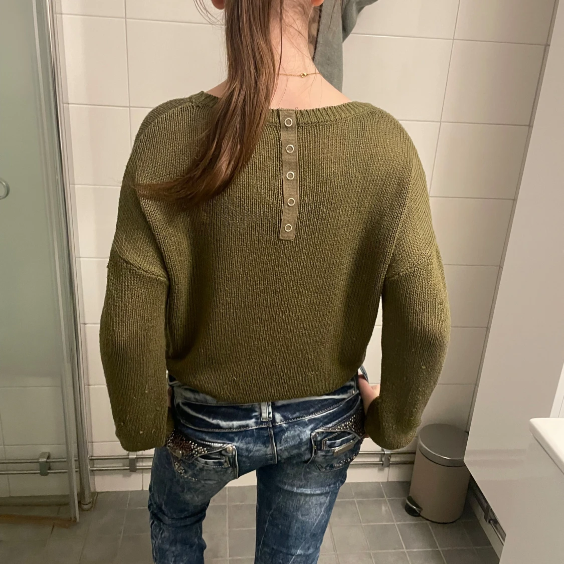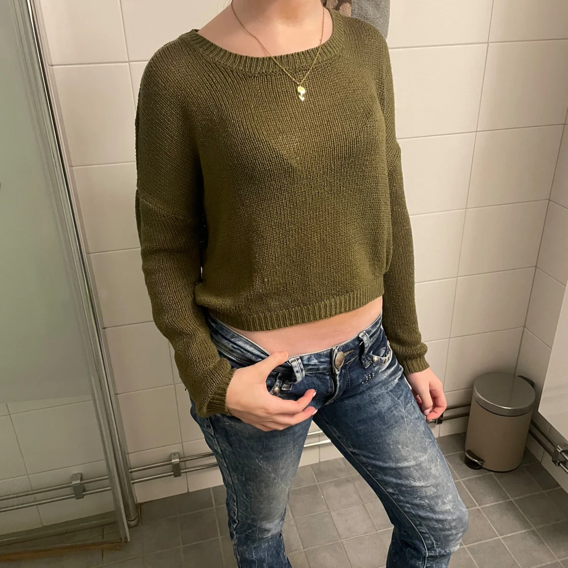 Säljer en olivgrön stickad tröja med en croppad design. Tröjan har långa ärmar och en rund halsringning, perfekt för en avslappnad stil.Super fin också💞💞