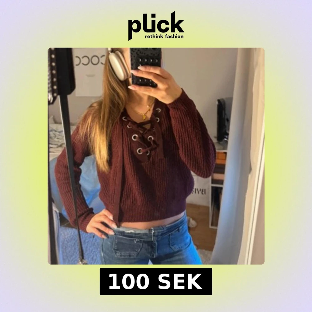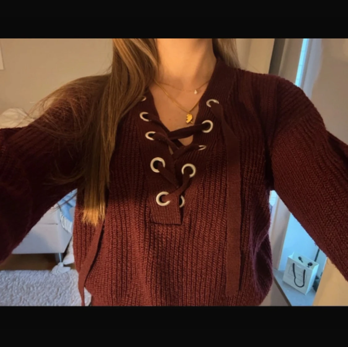 Mysig vinröd stickad tröja med snygg snörning framtill och grova öljetter. Tröjan är croppad och har lång ärm. Den är i storlek xs och märket är h&m.