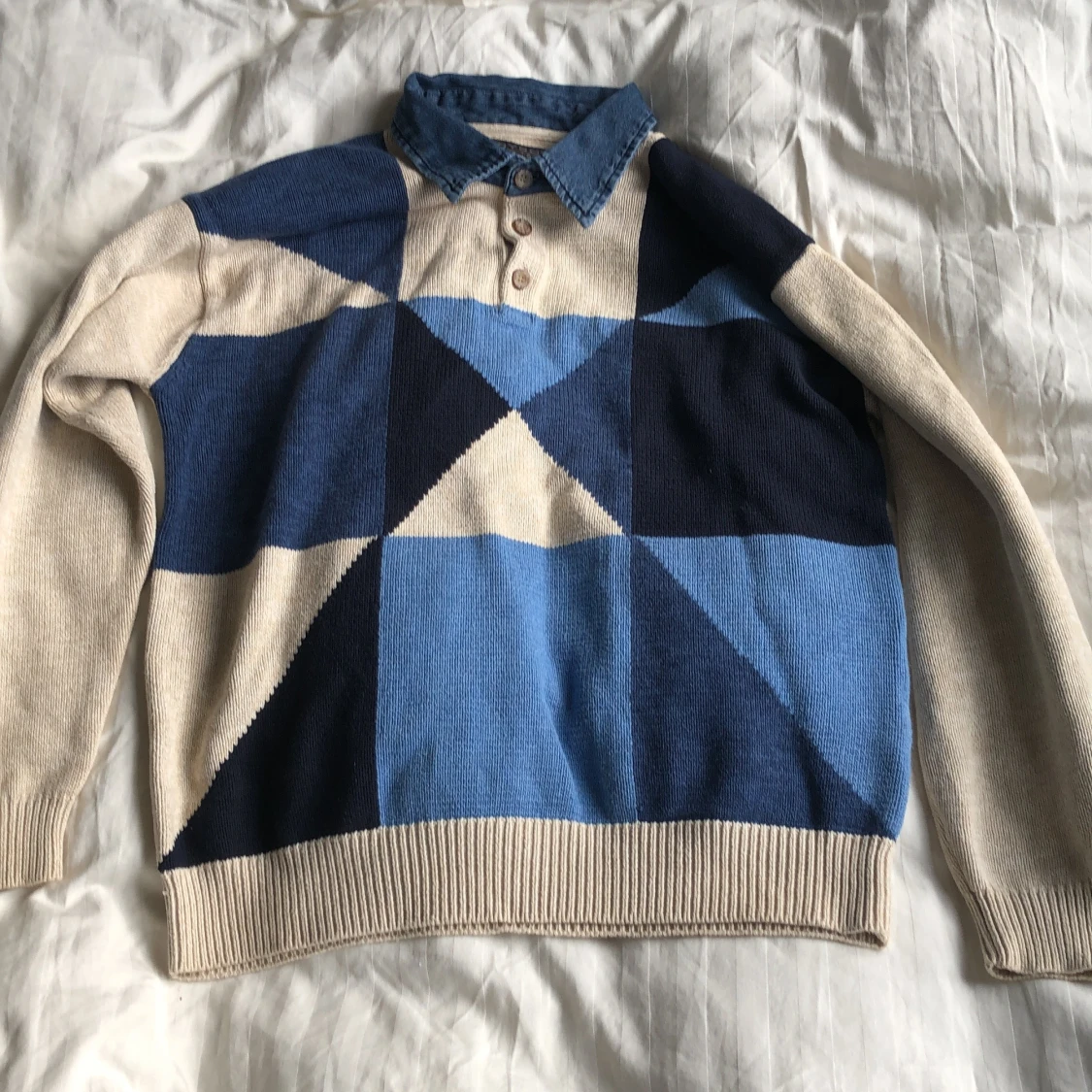 Otroligt fet stickad tröja med fin färg ”block”, säljes då den på något sätt blivit för stor av användning osv. Köpt secondhand men extremt fin
