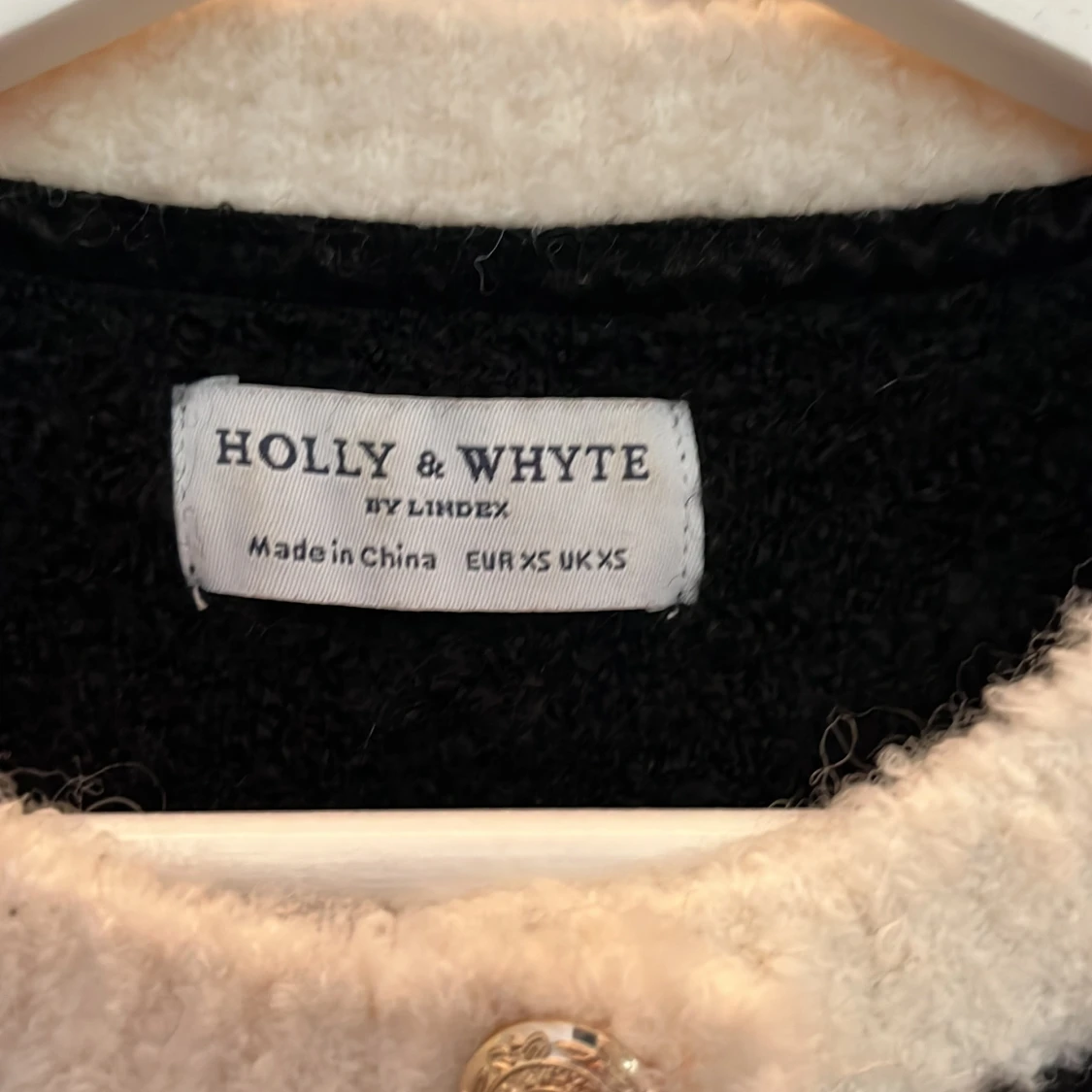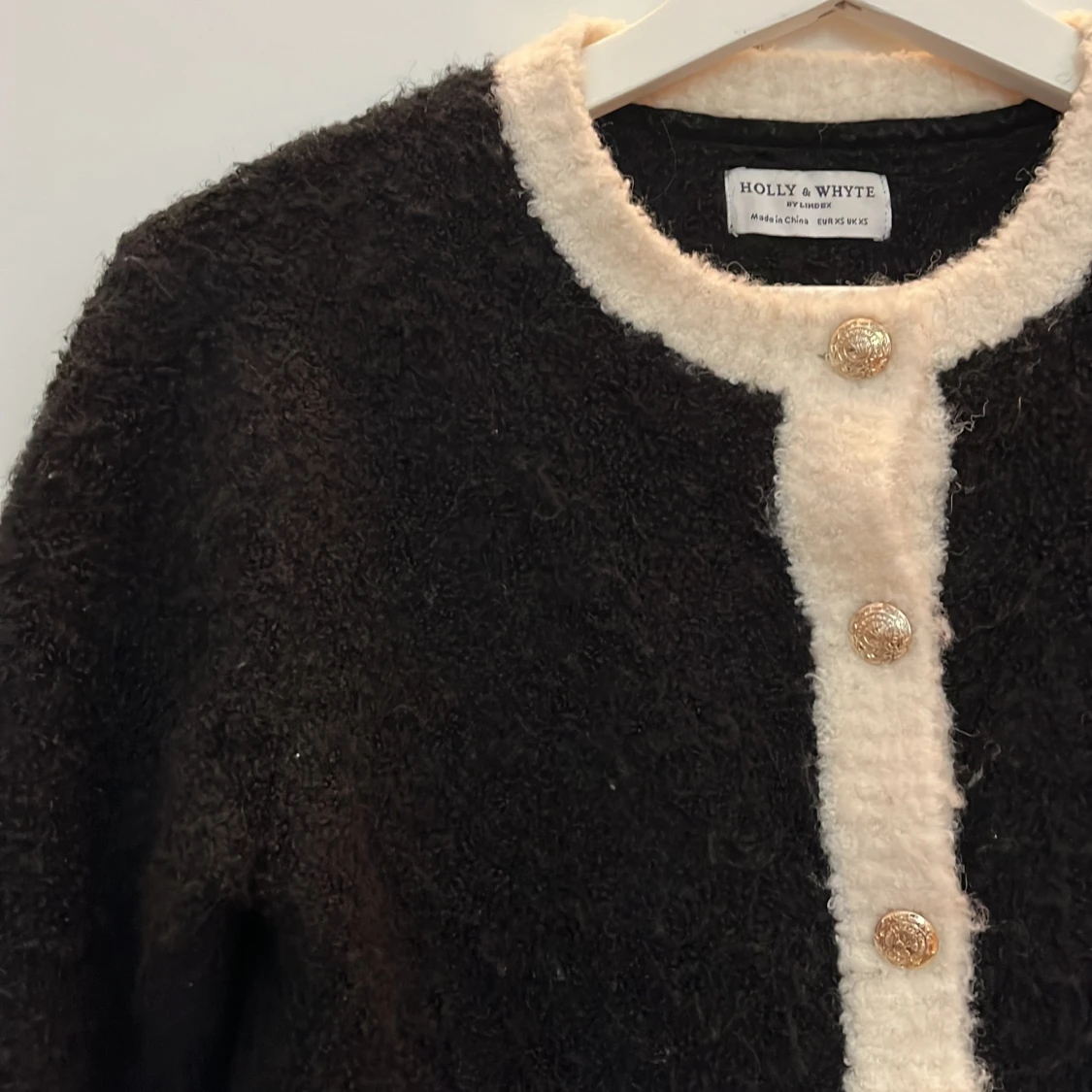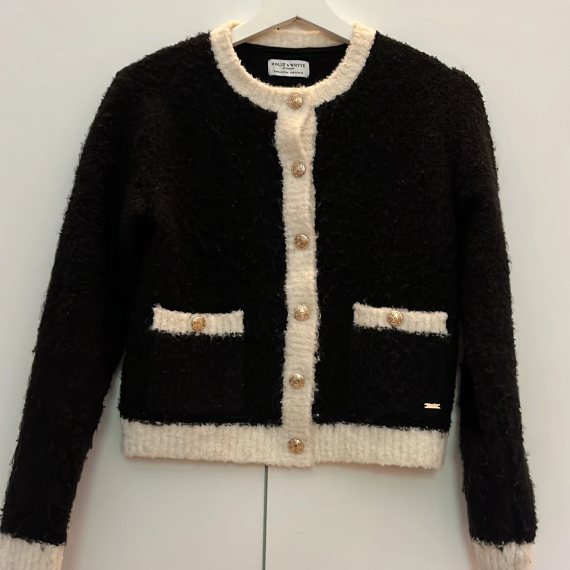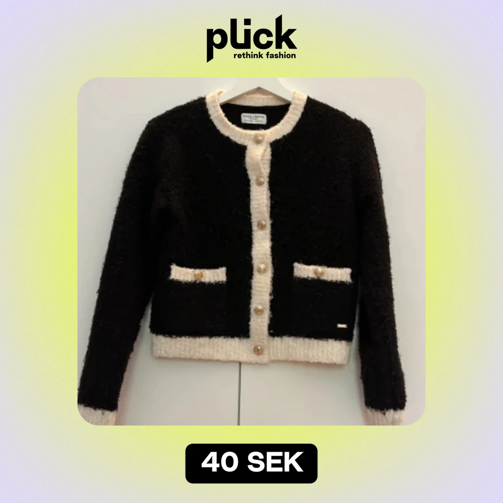 Fin stickad kofta med vita detaljer och guldknappar. Börjar bli lite nopprig i materialet därav priset annars jättefin🌷💖