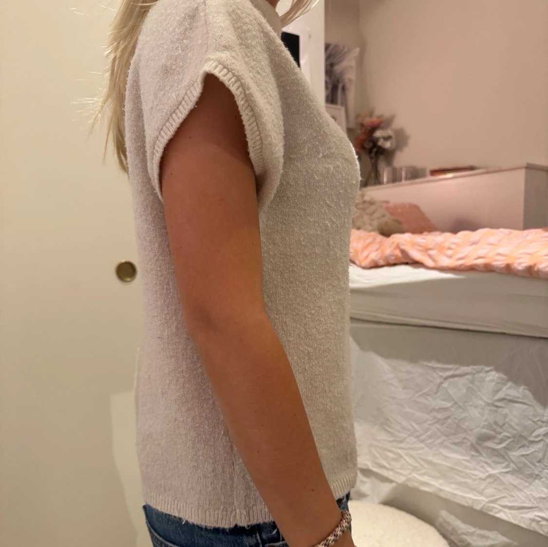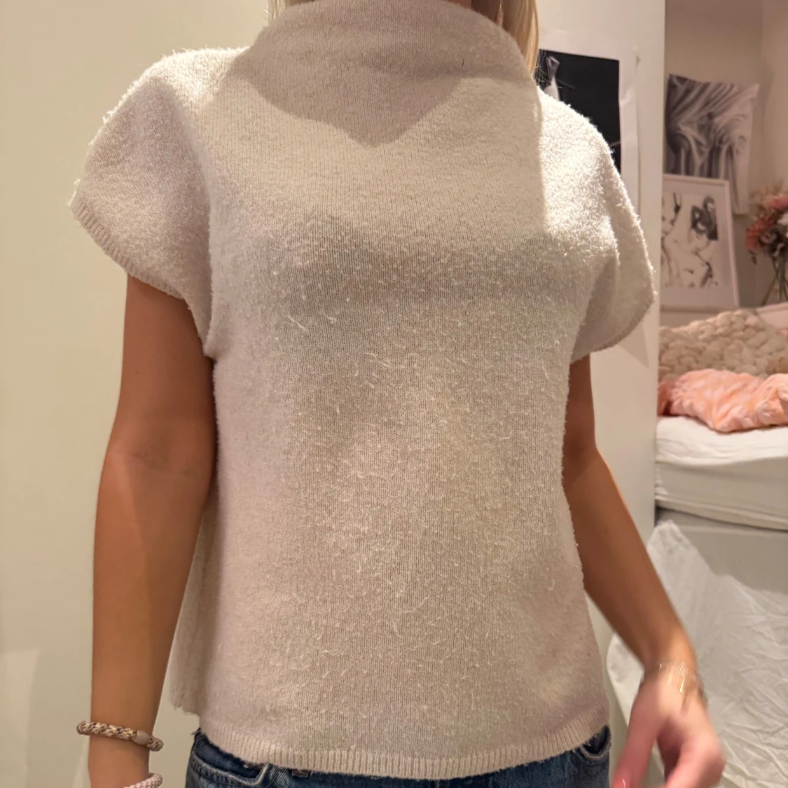 Säljer en stilren beige stickad topp med korta ärmar och hög krage. Perfekt för en avslappnad men ändå chic look. Lite nopprig