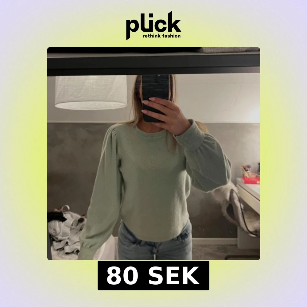 Superfin ljusgrön stickad tröja med puffiga ärmar och rund hals. Tröjan har en mjuk och mysig känsla, perfekt att matcha med jeans eller kjol. Stilren design utan mönster och med ribbade muddar vid ärmslut och hals.
