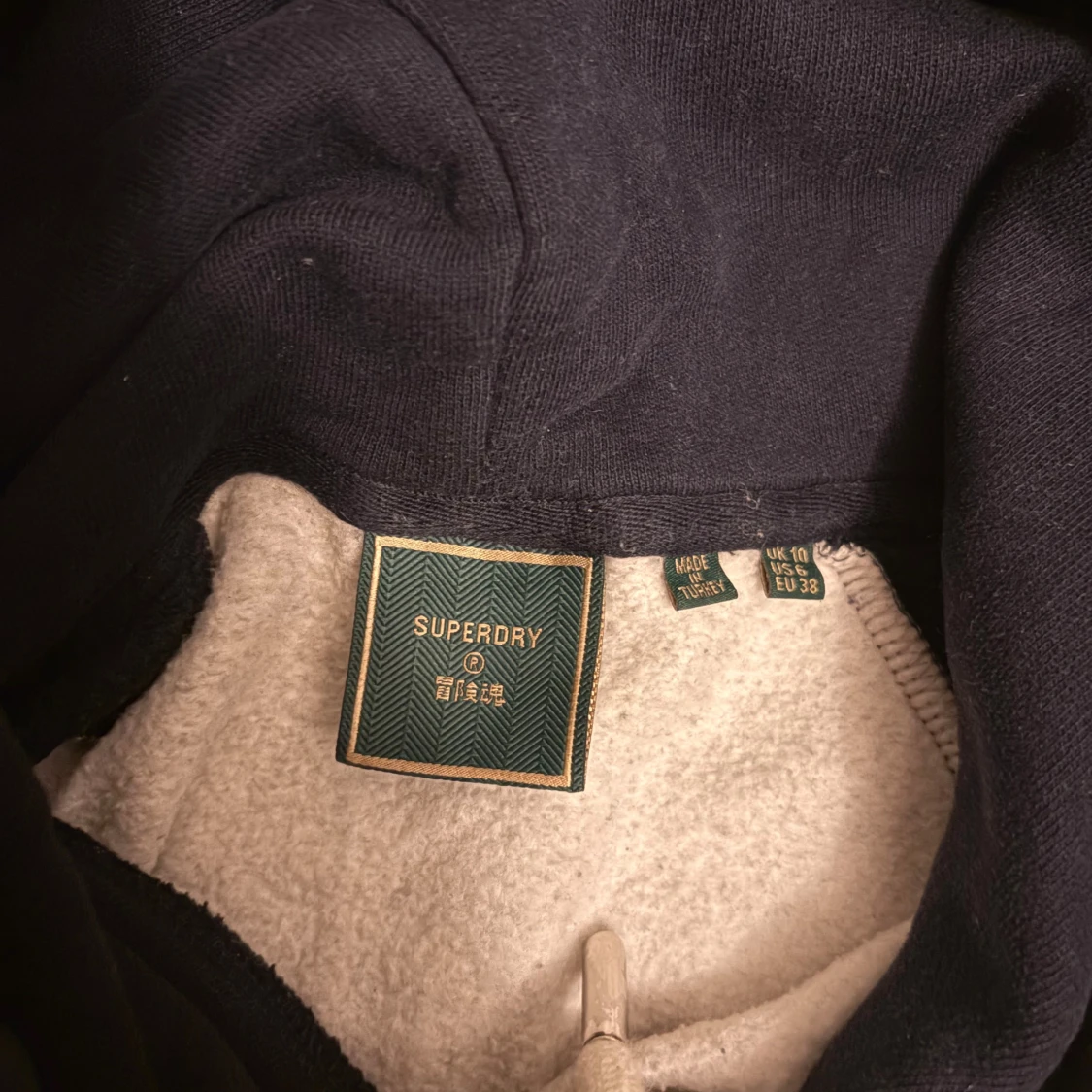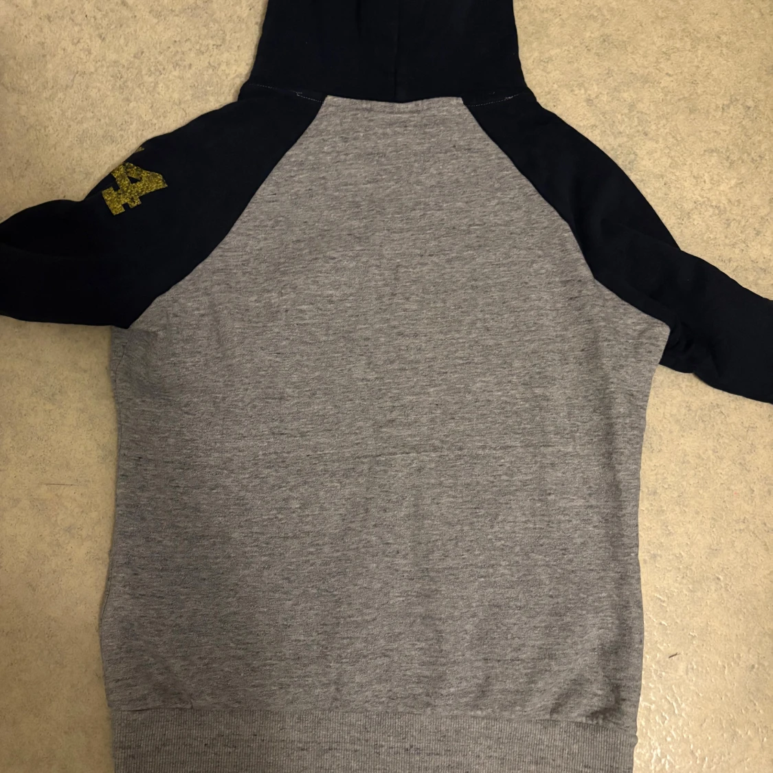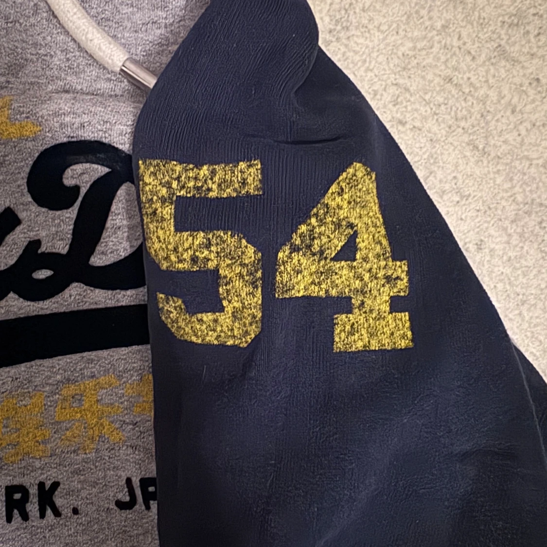 Snygg hoodie från Superdry i grått med marinblå ärmar och huva. Stor tryckt logga på bröstet och siffran 54 i gult på ena ärmen. Mjuk insida, känguruficka och vita snören vid huvan. Perfekt för chill dagar och streetstyle.
