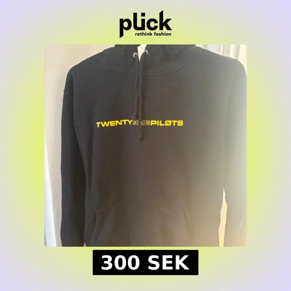 Säljer en svart hoodie från Just Hoods med gult Twenty One Pilots-tryck fram och stort gult logomärke på ryggen. Tröjan har huva med dragsko och mjukt fleecefoder på insidan. Perfekt för dig som gillar bandmerch och vill ha en skön och snygg hoodie. Använd fåtal gånger. Storlek M