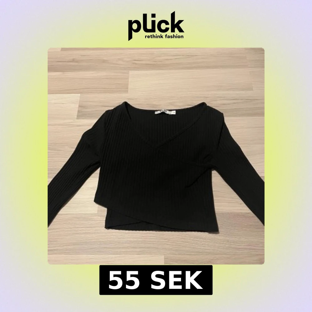 Snygg svart ribbad omlottopp med långa ärmar. Perfekt för en stilren look. Toppen har en croppad passform och en v-ringad design.