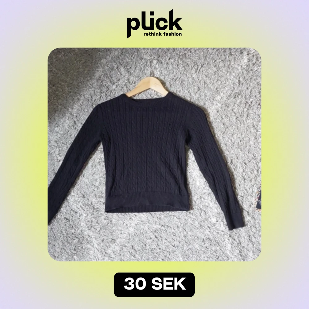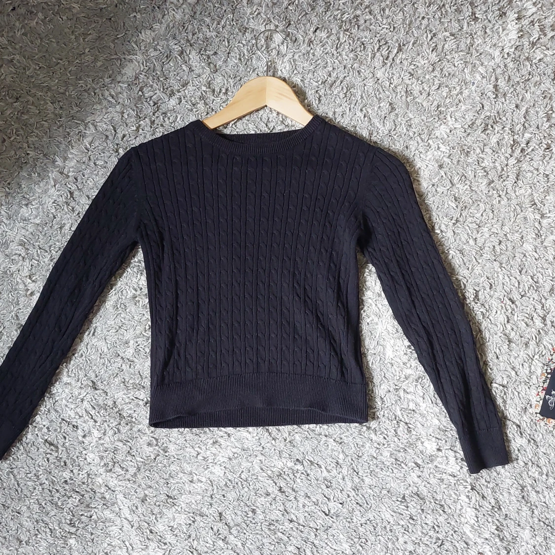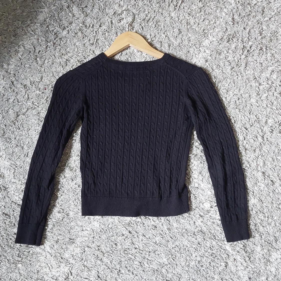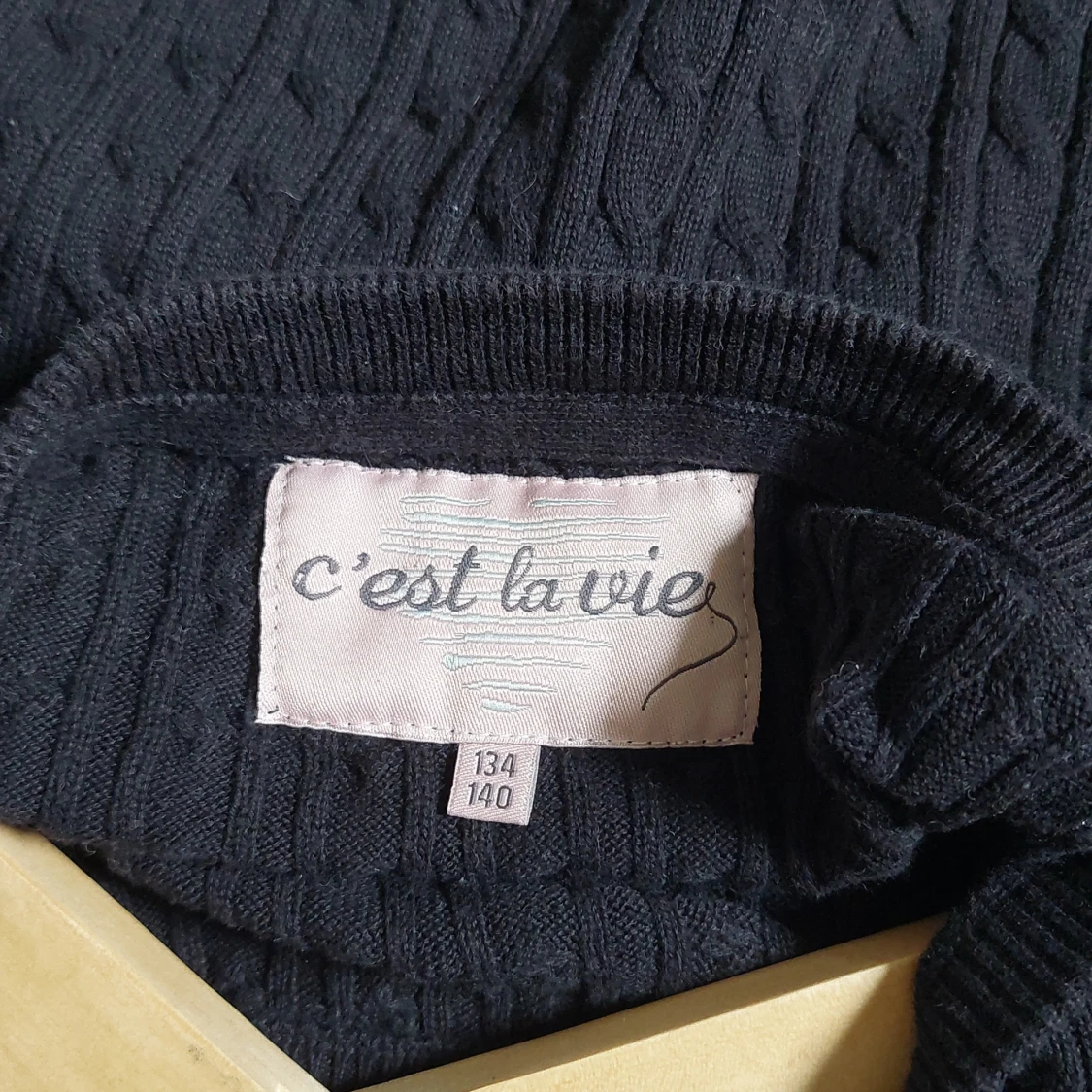 Svart stickad tröja med kabelstickat mönster. Storlek 134/140 men passar som en xxs/xs. Mycket fint skick och säljer då den inte kommer till användning