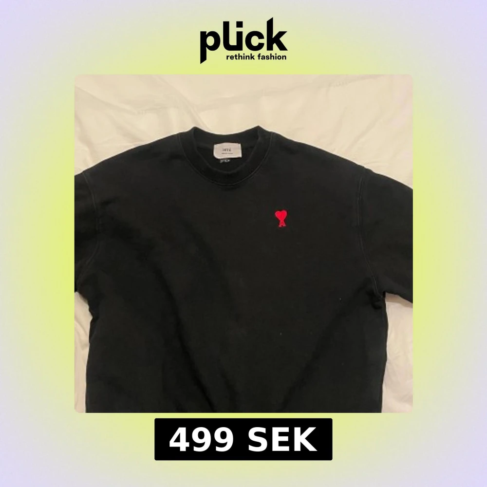 Svart sweatshirt från Ami med hjärtdetalj - Hel ny svart sweatshirt från Ami Paris med en unik logga. Materialet är mjuk bomull och logotypen Ami syns även baktill i nacken. Perfekt för en clean och stilren look. Hör av dig vid minsta funderingar!!!