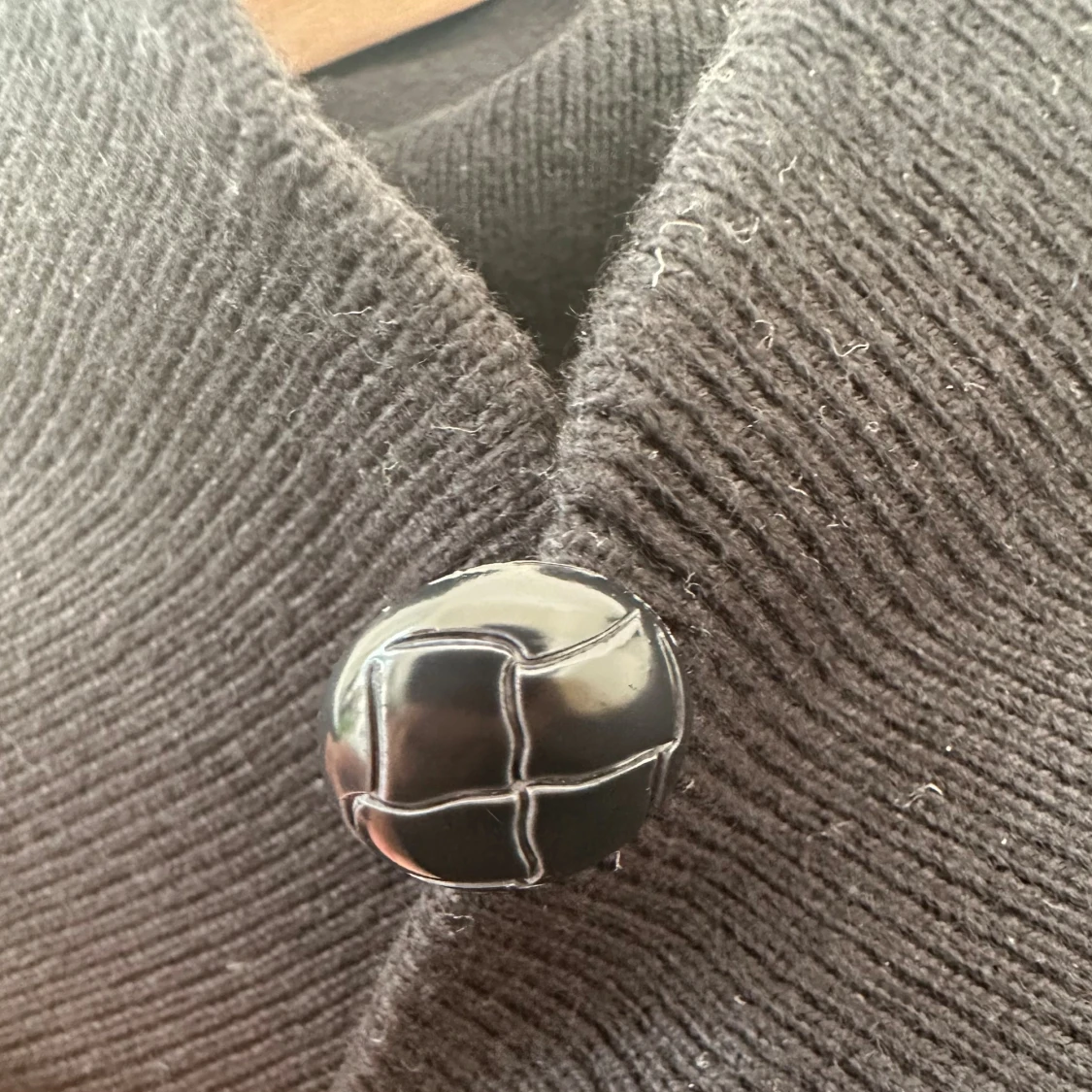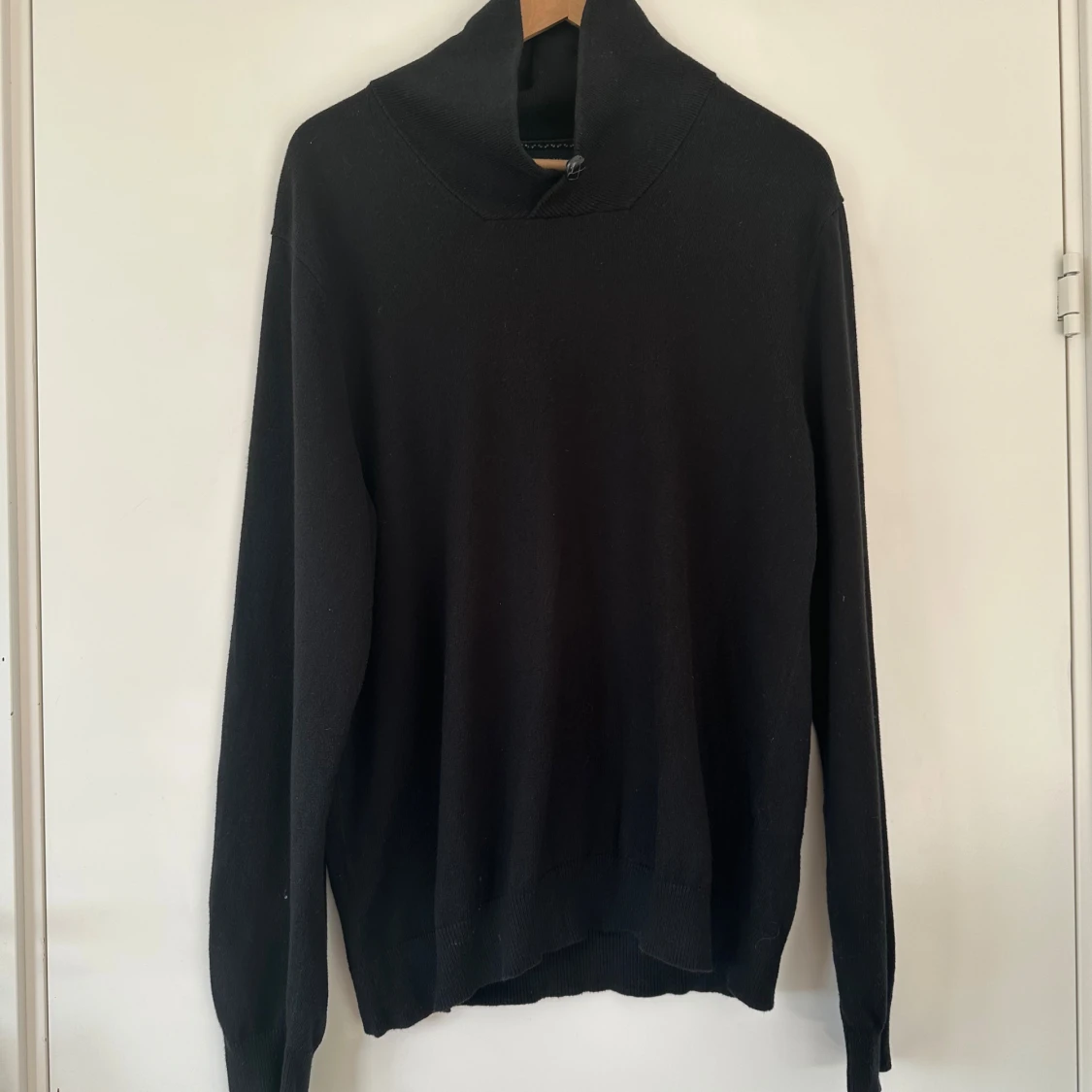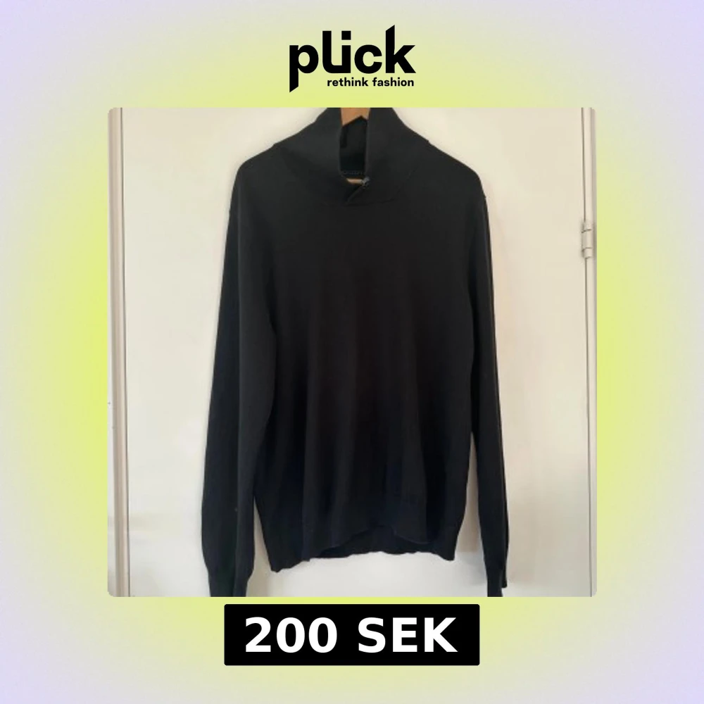 Svart stickad tröja i mjuk bomull och cashmere / kashmir - blandning i klassisk modell. Hög krage och en dekorativ knapp. Tröjan har en liten Tommy Hilfiger logga på vänster ärm. Mycket gott skick. Hämtas i Stockholm eller skickas mot porto