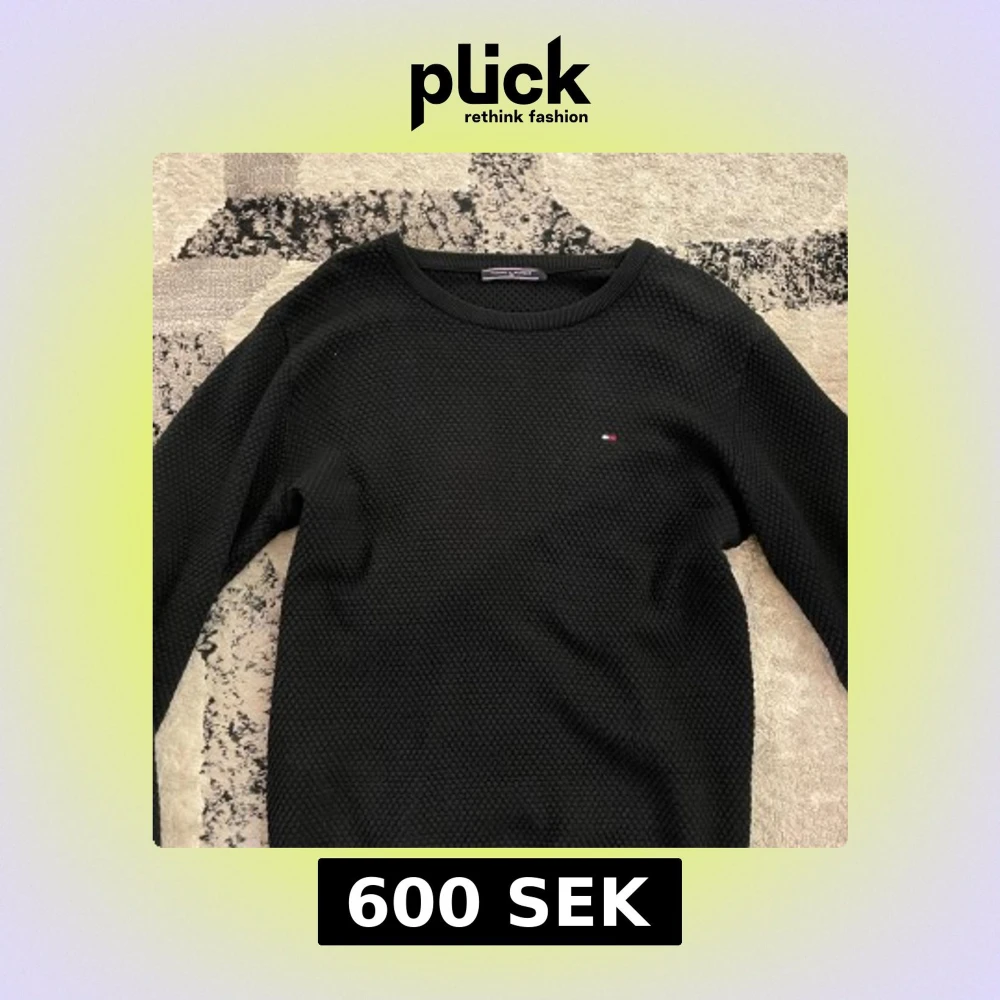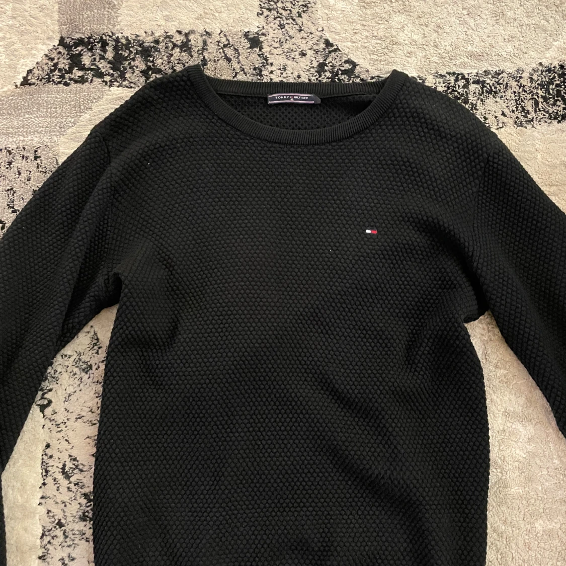 Säljer en svart stickad tröja från Tommy Hilfiger med diskret logga på bröstet. Tröjan har rund halsringning och lång ärm, perfekt för en stilren och enkel look.