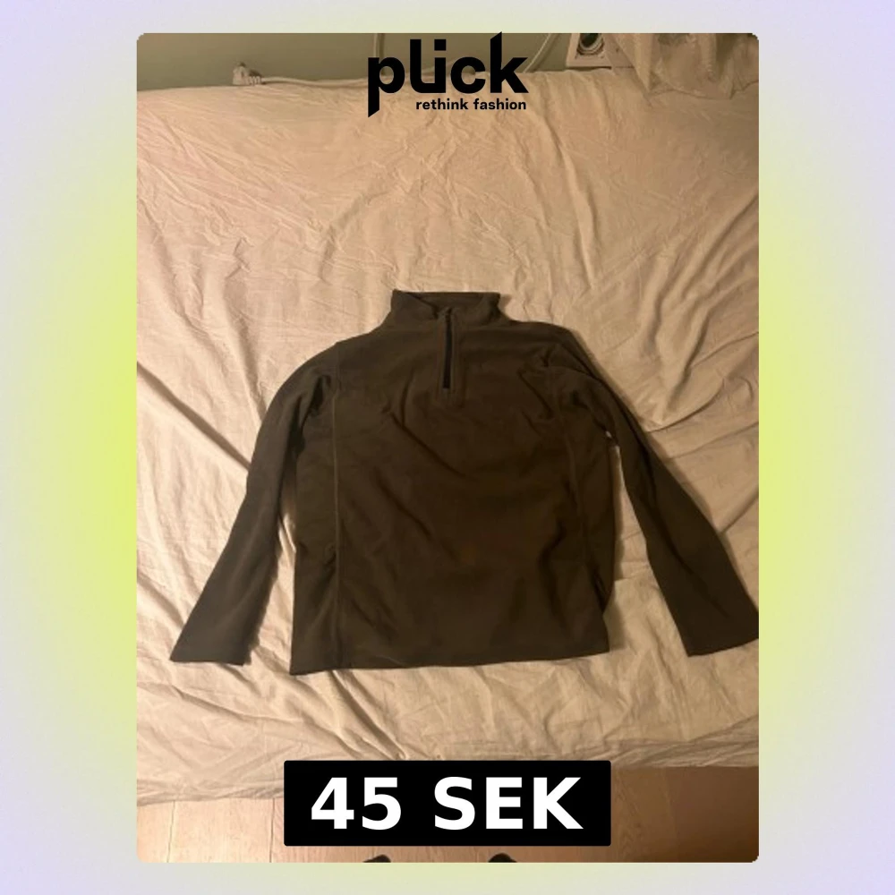 Säljer en mörkbrun fleece-tröja med halv dragkedja och hög krage. Tröjan har långärmad passform och är perfekt för kyliga dagar. Materialet är mjukt och värmande, och modellen är normal i passningen. Enkel och stilren design utan synliga loggor.