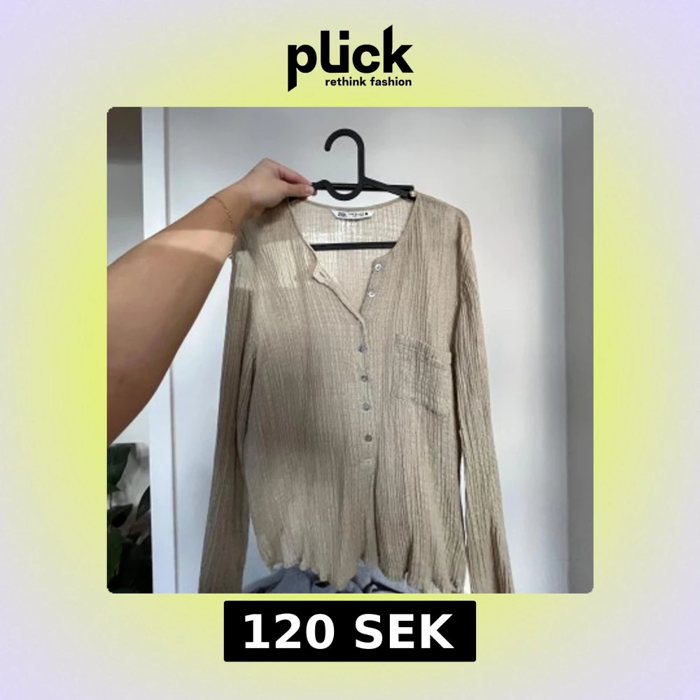 Säljer en beige ribbad tröja från Zara med knappar framtill och en bröstficka. Tröjan har långa ärmar och en avslappnad passform.