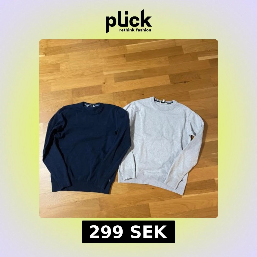 Säljer två stilrena stickade tröjor i mörkblått och ljusgrått. Båda kostar 299 totalt. Perfekta för kyligare dagar med ribbade muddar vid ärmslut och nederkant. Passar bra till både jeans och chinos.
