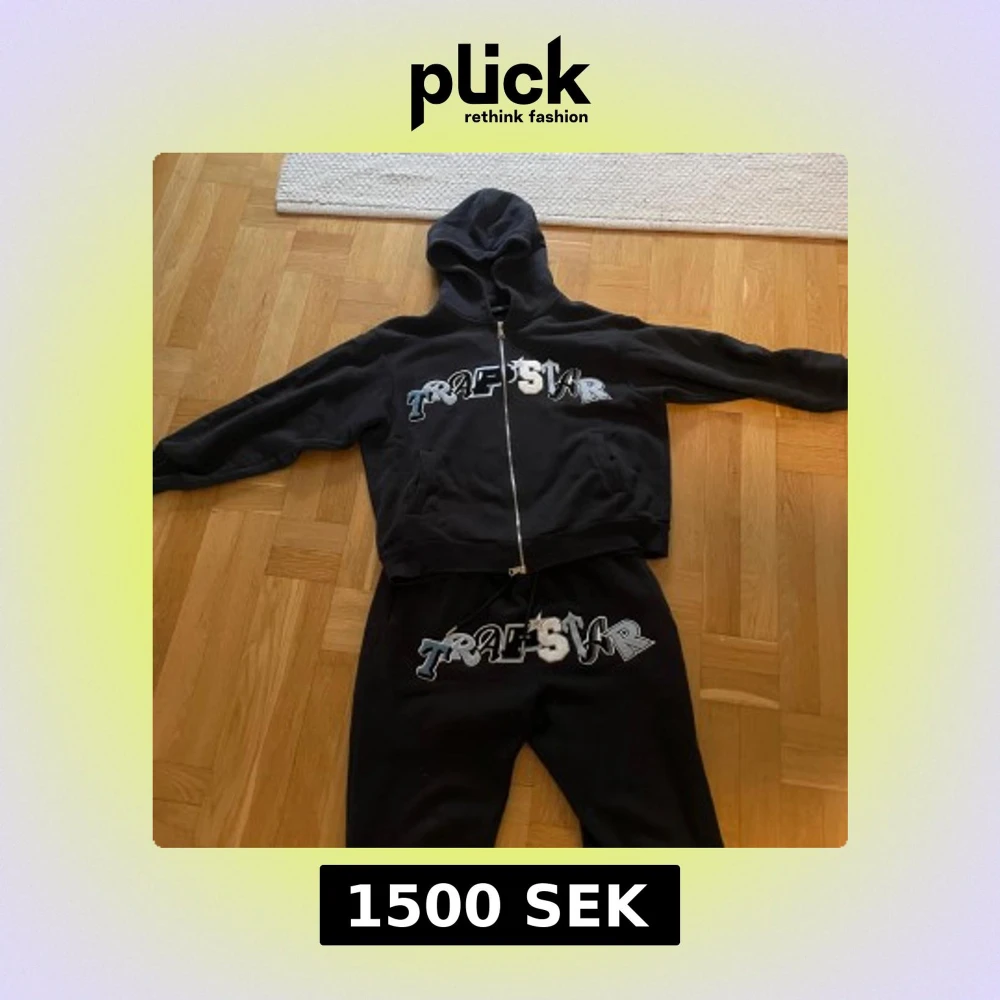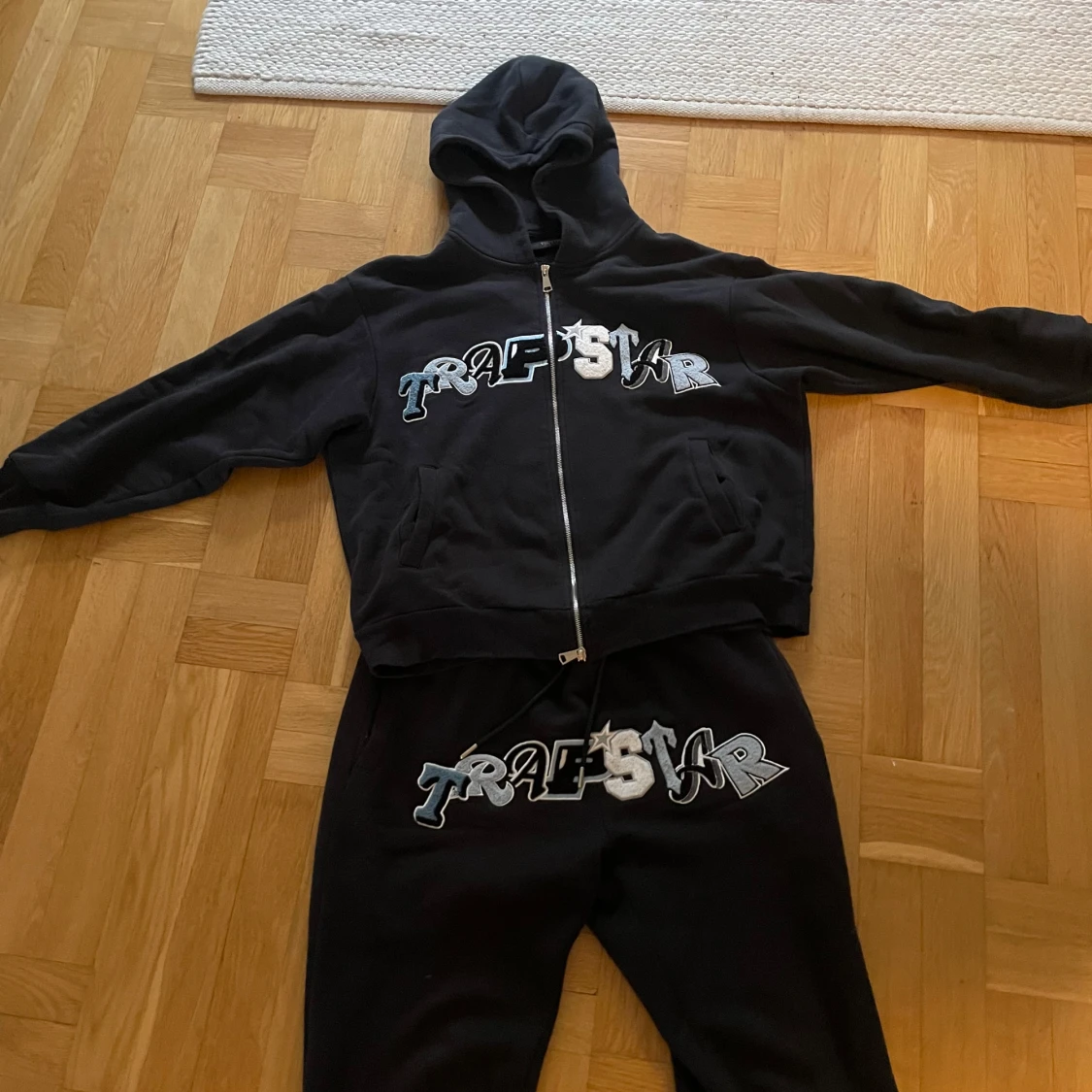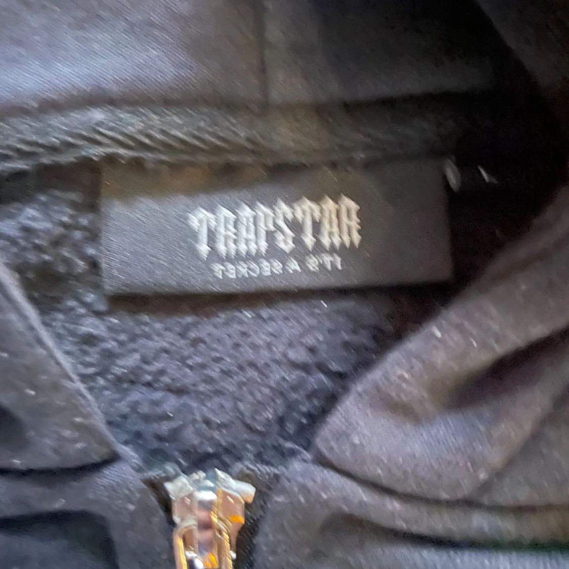 Säljer en svart hoodie från Trapstar med dragkedja och tryck på bröstet. Perfekt för en avslappnad stil. Hoodien har långa ärmar och en bekväm passform. Resselar för ungefär 220£ sälja nu till ett väldigt bra pris