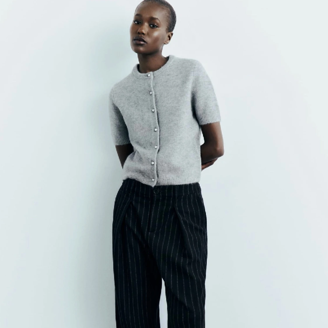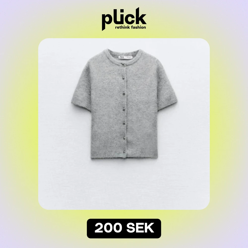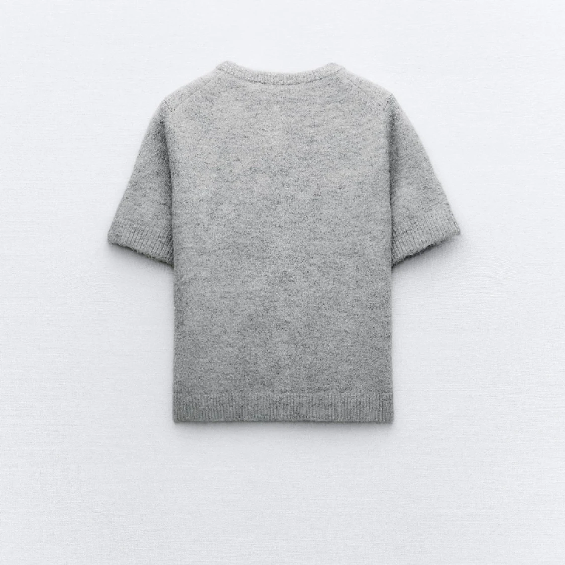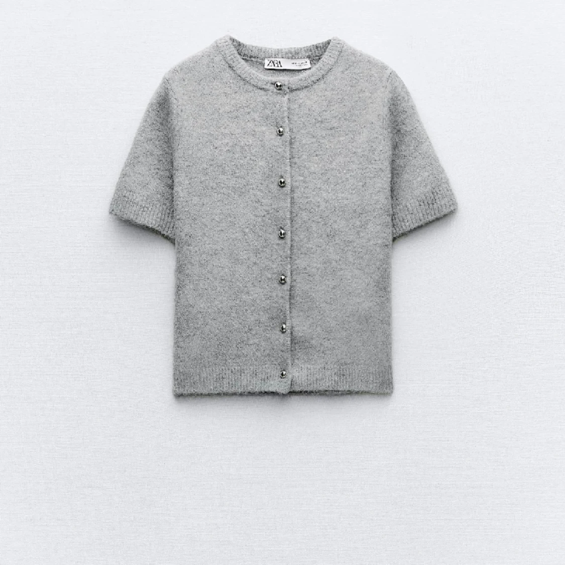Stickad tröja som är kort ärmar och fina knappar i mitten från zara, aldrig använd.💗lite liten i stoleken så passar M/L