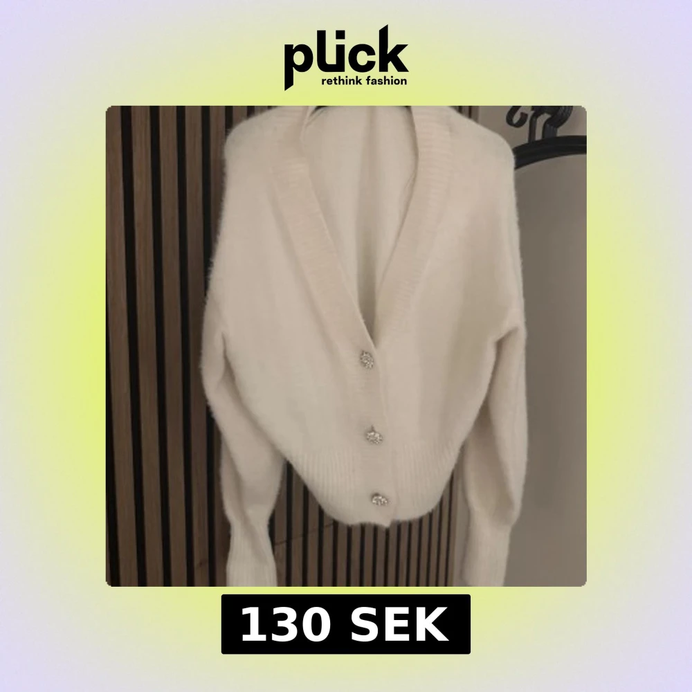 Säljer en fluffig och mjuk vit kofta med djup v-ringning och tre glittriga dekorativa knappar framtill. Koftan har långa ärmar.
