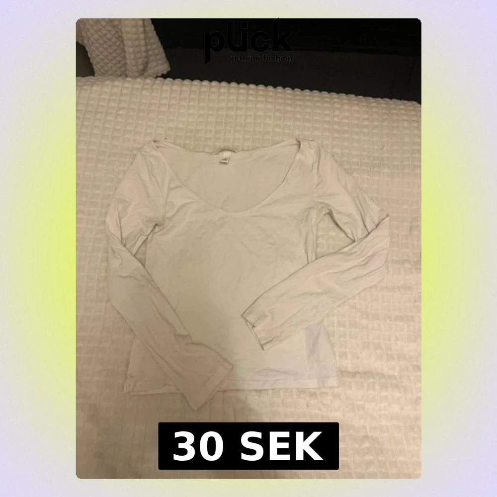 Säljer en enkel och stilren vit långärmad topp med djup rundad ringning. Toppen är i mjuk bomull och har en slim passform som sitter snyggt på kroppen.