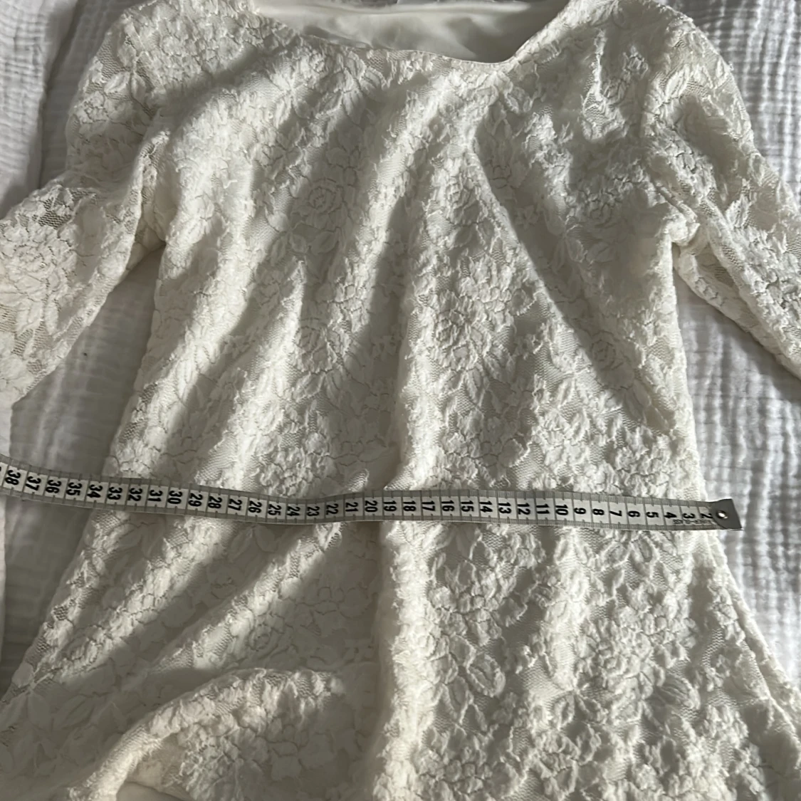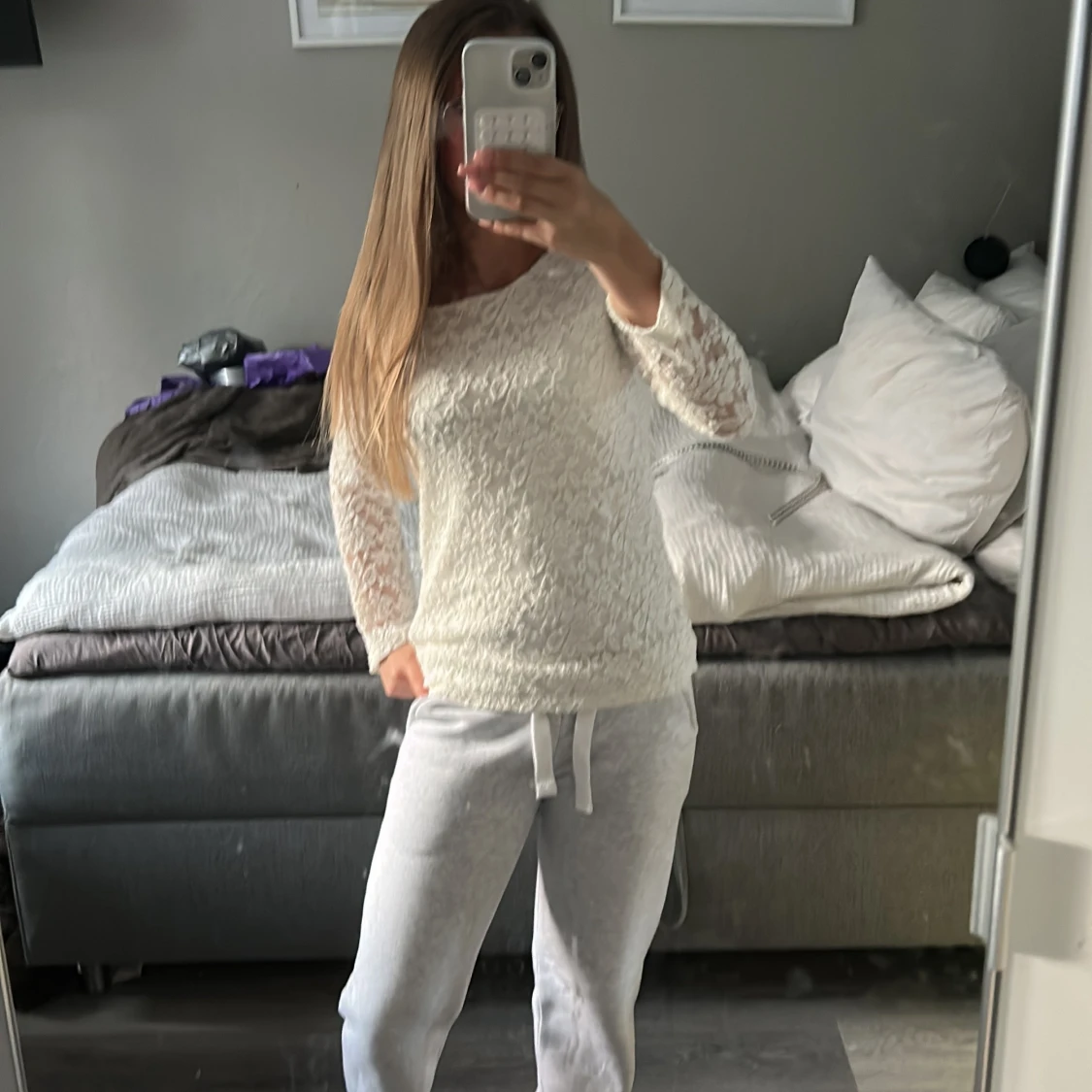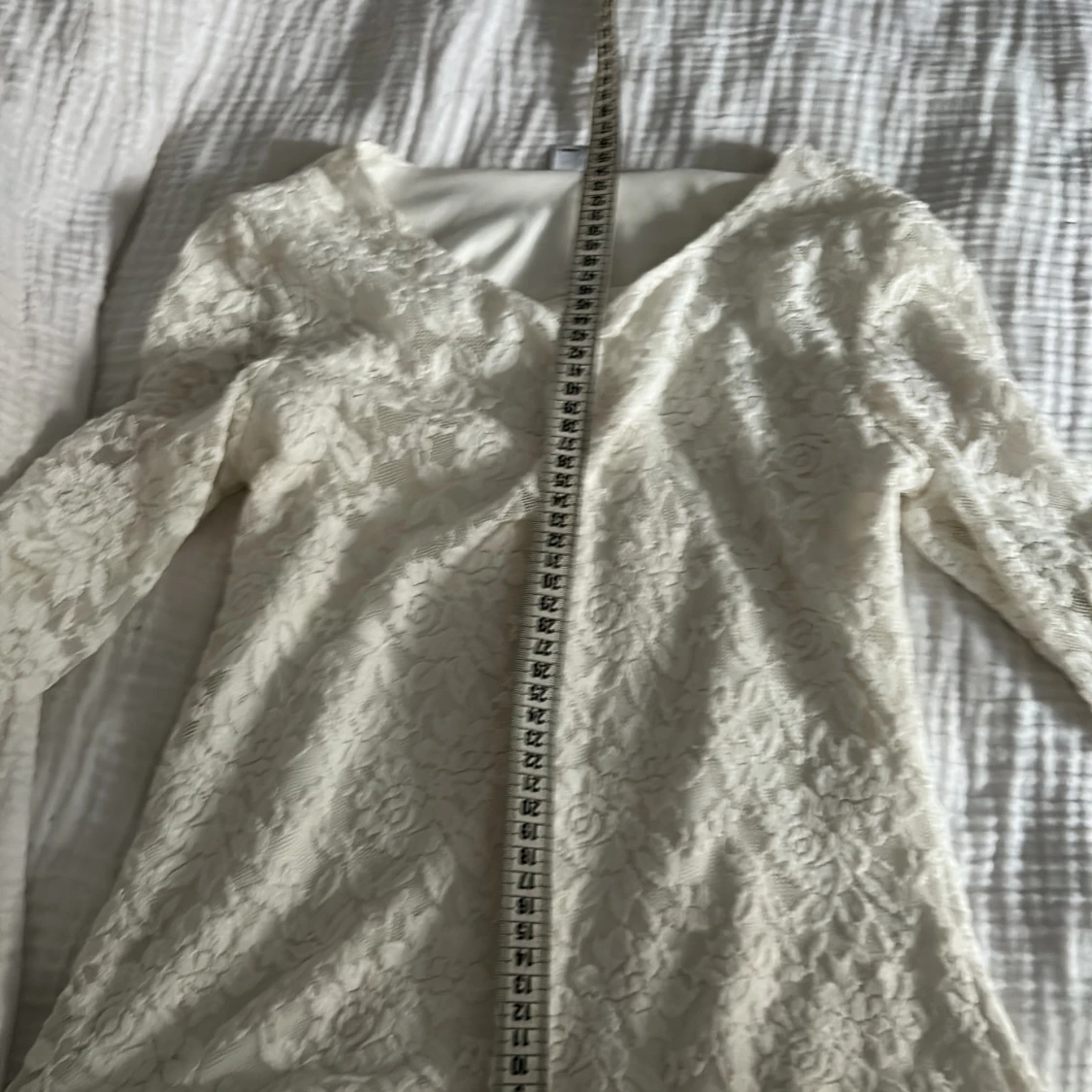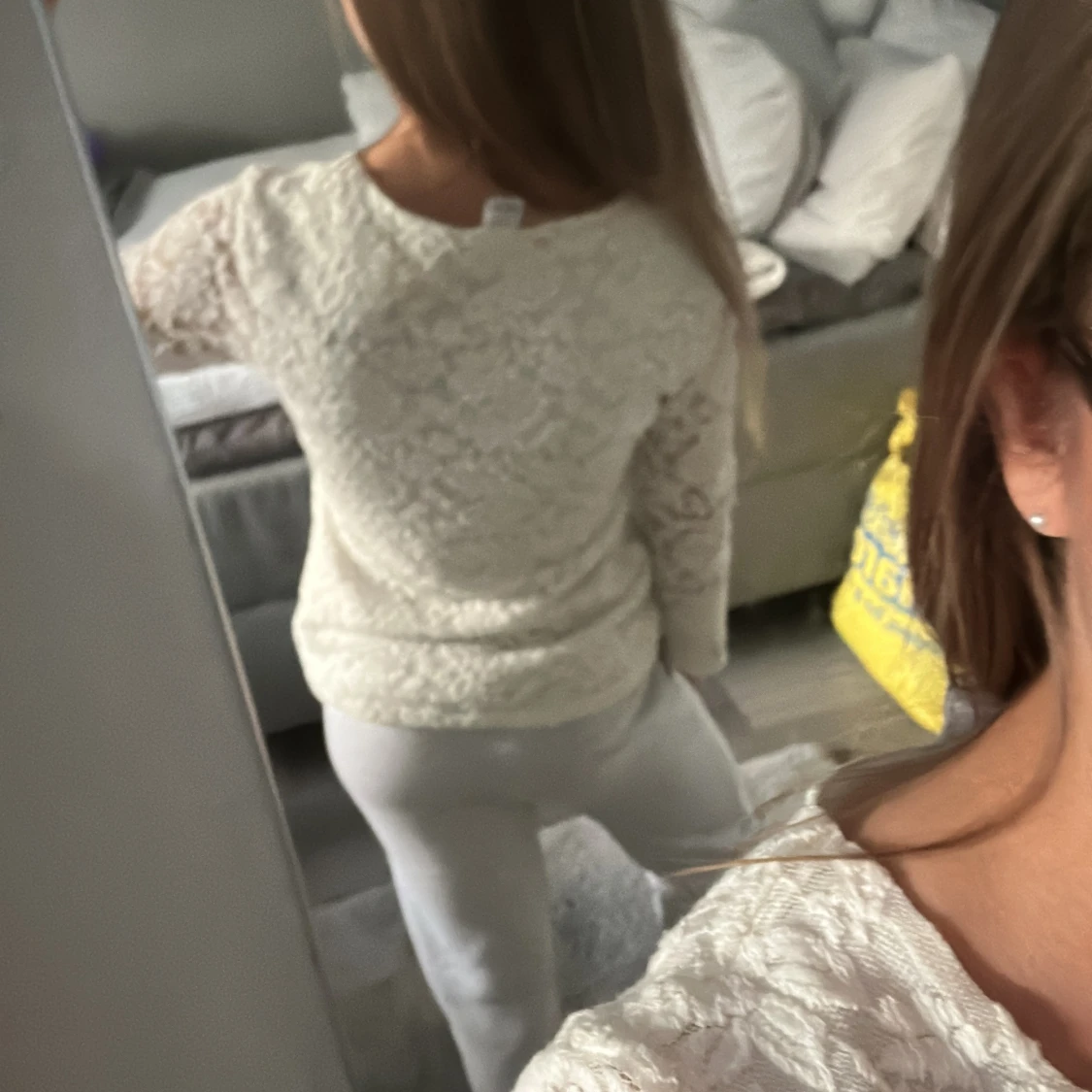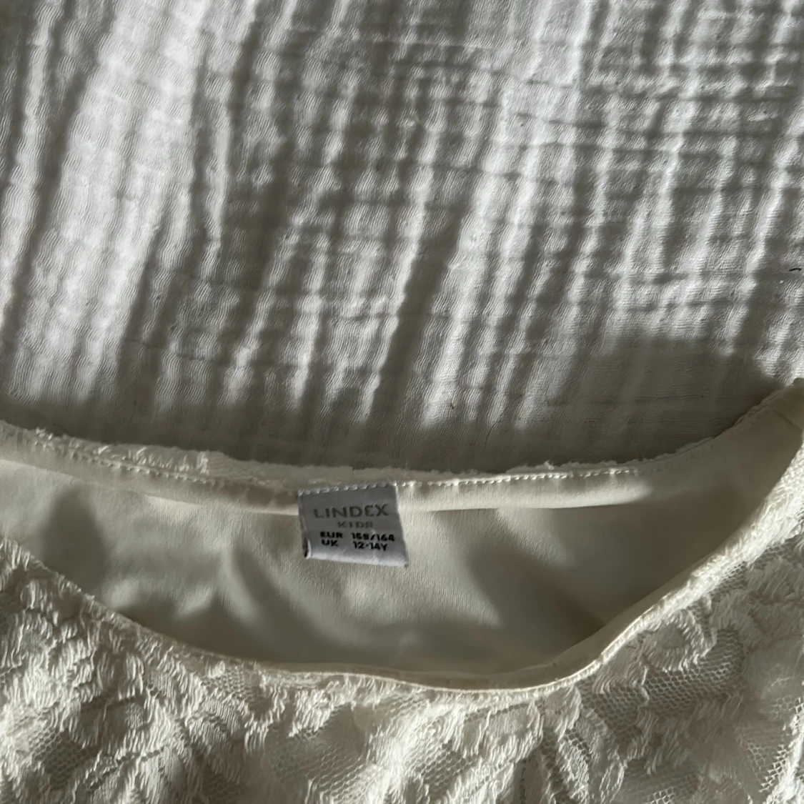 Supersöt vit blus från Lindex i storlek 158/164. Blusen har långa ärmar och är helt täckt av blommig spets med mjukt innerfoder. Perfekt när du vill känna dig lite extra fin och ändå vara bekväm.