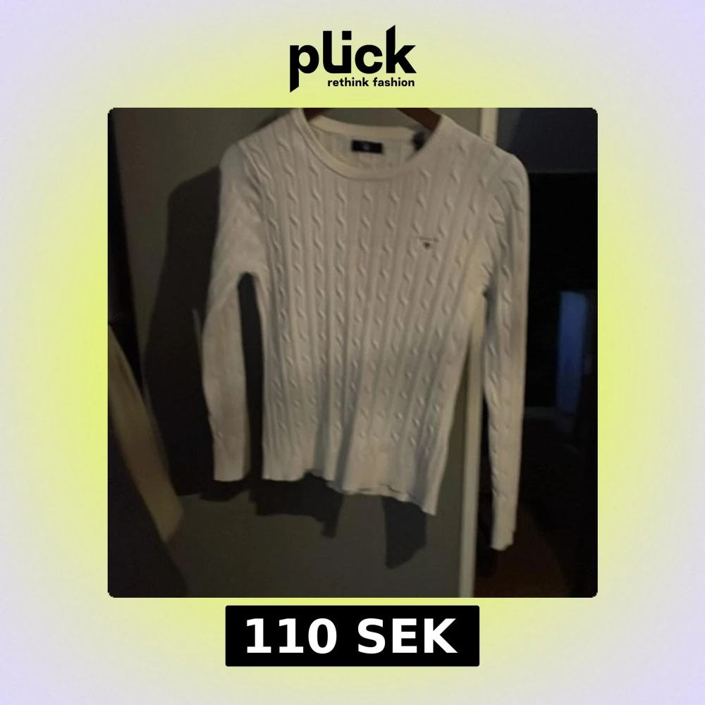 Säljer en stilren vit stickad tröja från GANT med kabelstickat mönster. Tröjan har långa ärmar och en rund halsringning. Perfekt för en klassisk och tidlös look.
