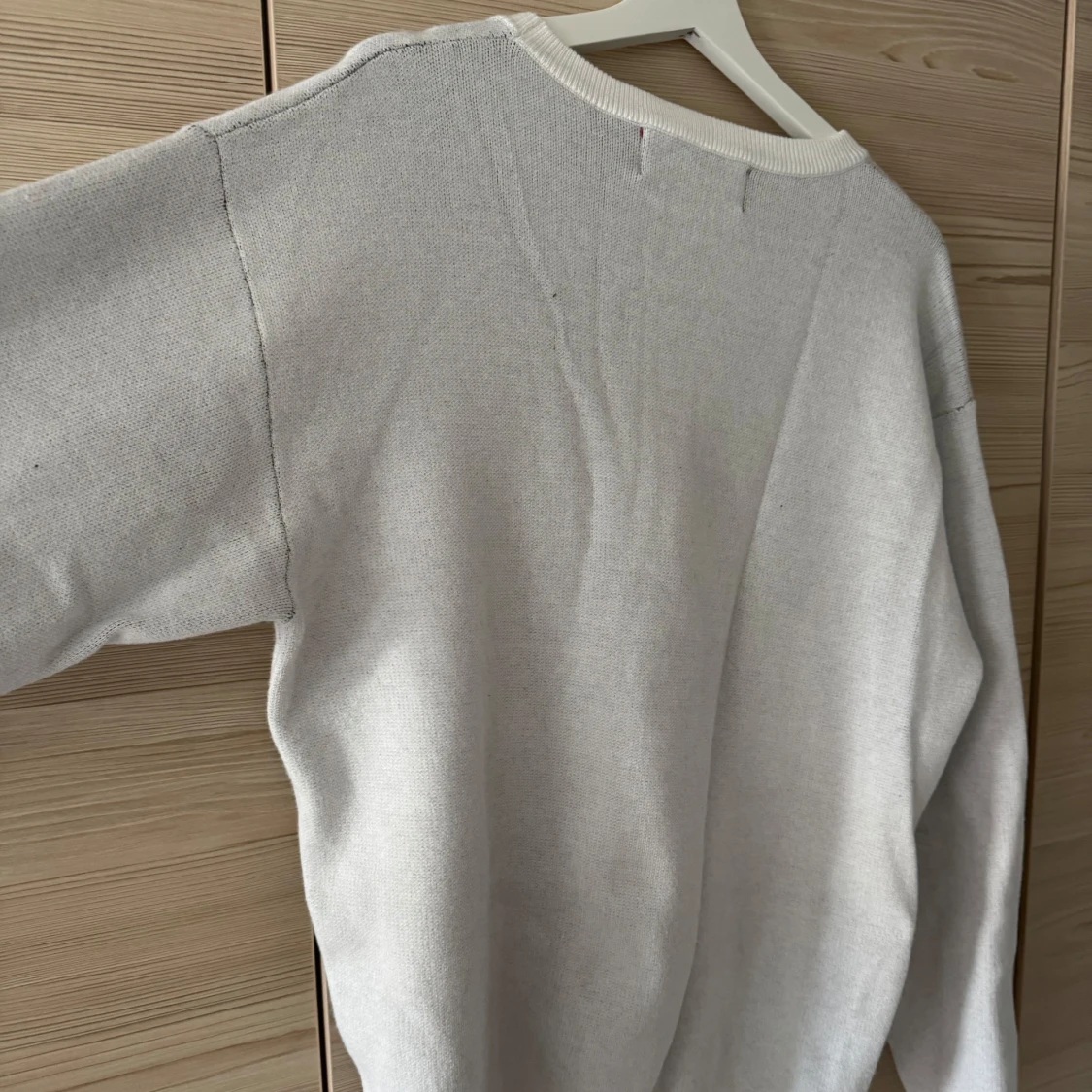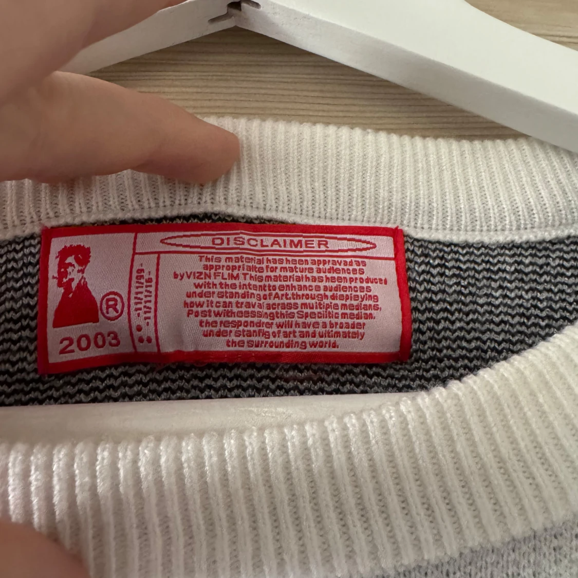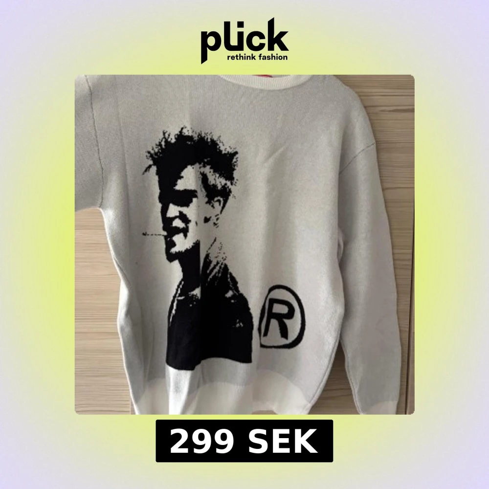 Säljer en vit stickad tröja från VIZN FLIM med ett stort svart tryck av Brad Pitt på framsidan. Tröjan är använd typ 1 gång och aldrig tvättat.