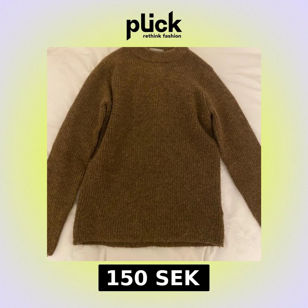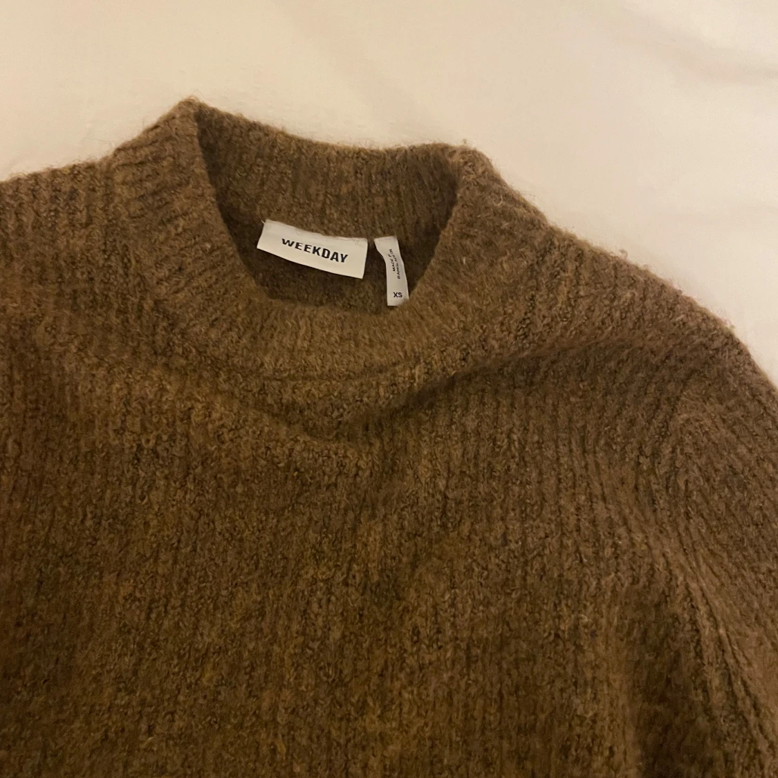 Säljer en mysig brun stickad tröja från Weekday. Perfekt för kyliga dagar med sin mjuka och varma känsla. Tröjan har långa ärmar och en klassisk rund halsringning.