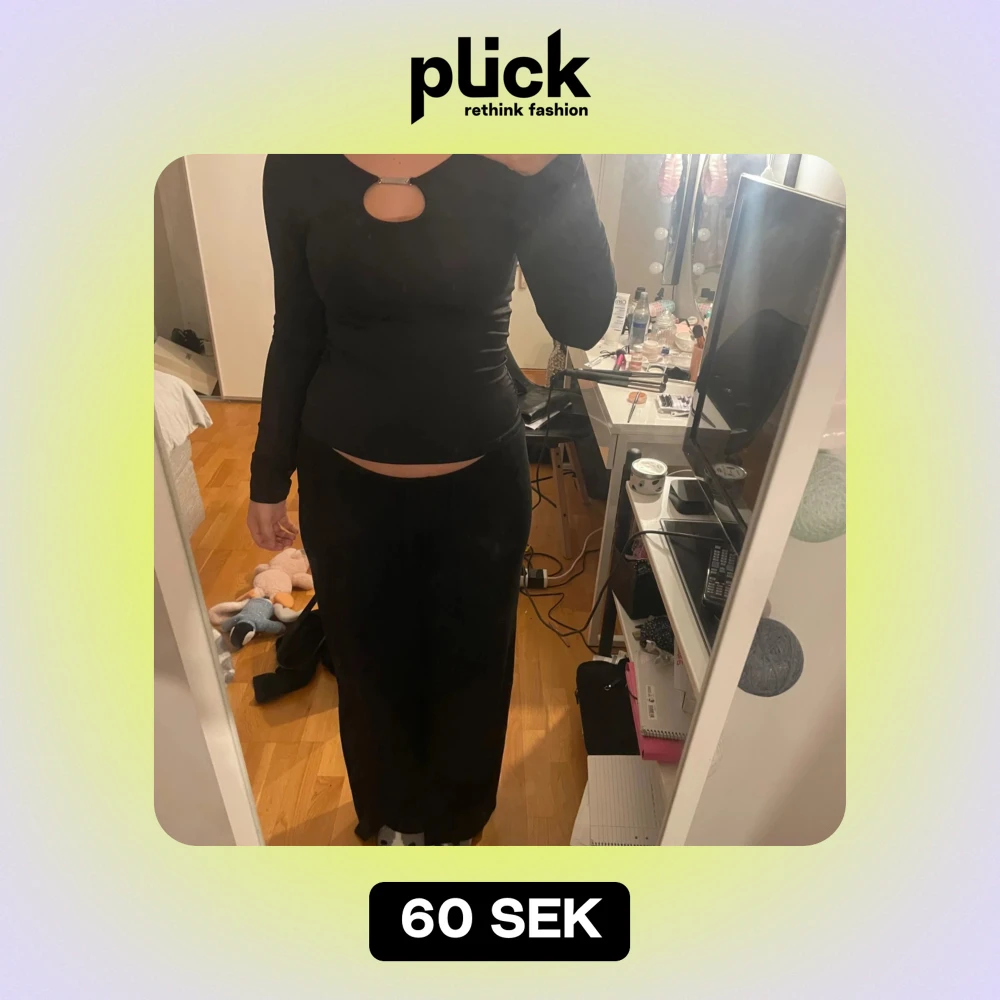 Säljer en svart långärmad topp från Weekday i storlek S. Toppen har en unik design med utskärningar framtill som ger en cool look. Perfekt för både vardag och fest! 🖤