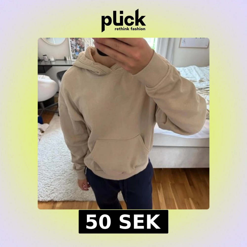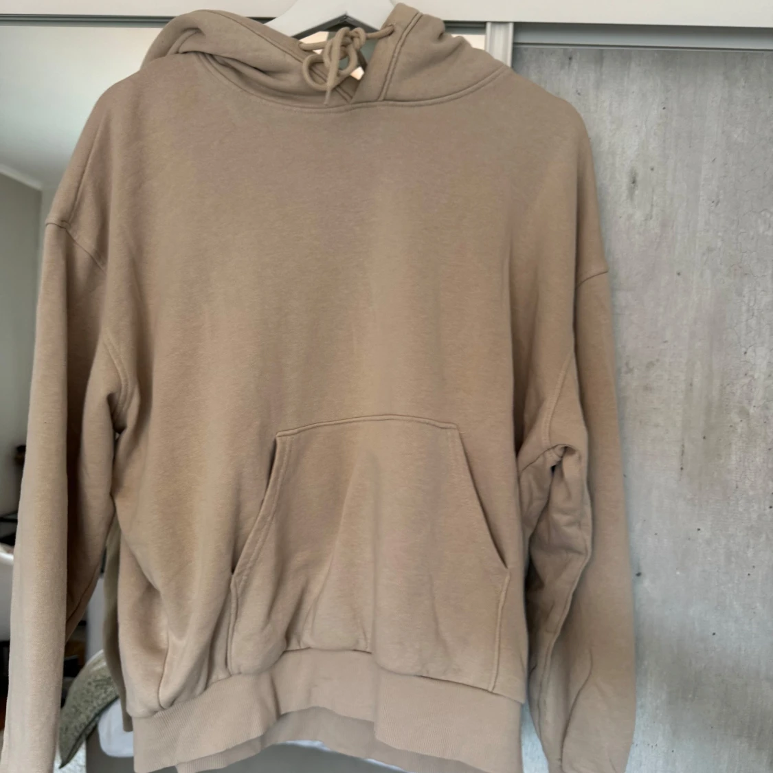 Säljer en stilren beige hoodie med huva och ficka framtill. Tröjan har ribbade muddar vid ärmslut och nederkant, samt snörning i huvan.🥰