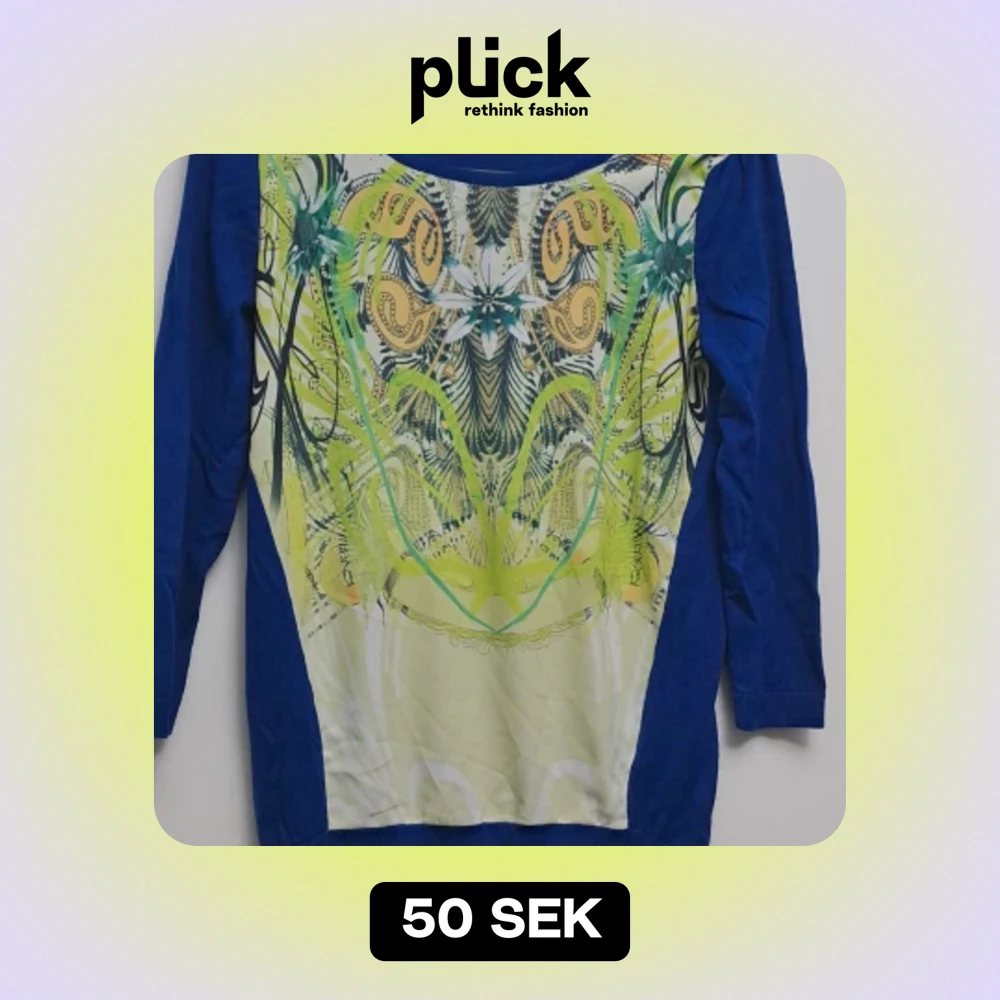En långärmad tröja i blått med ett färgglatt mönster på framsidan i grönt, gult och svart. Tröjan har en rund halsringning och är tillverkad i ett mjukt material.