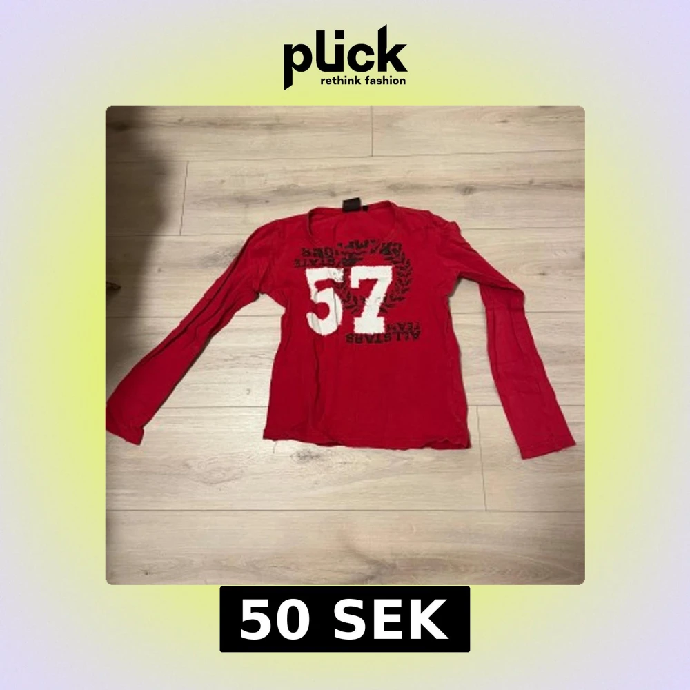 Säljer en röd långärmad tröja med ett stort vitt nummer 57 tryckt på framsidan. Tröjan har en avslappnad passform och är perfekt för en casual look. Passar bra till jeans eller shorts.