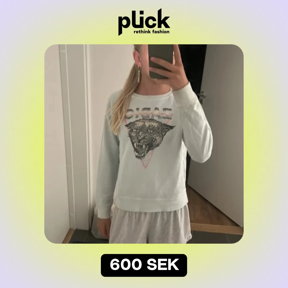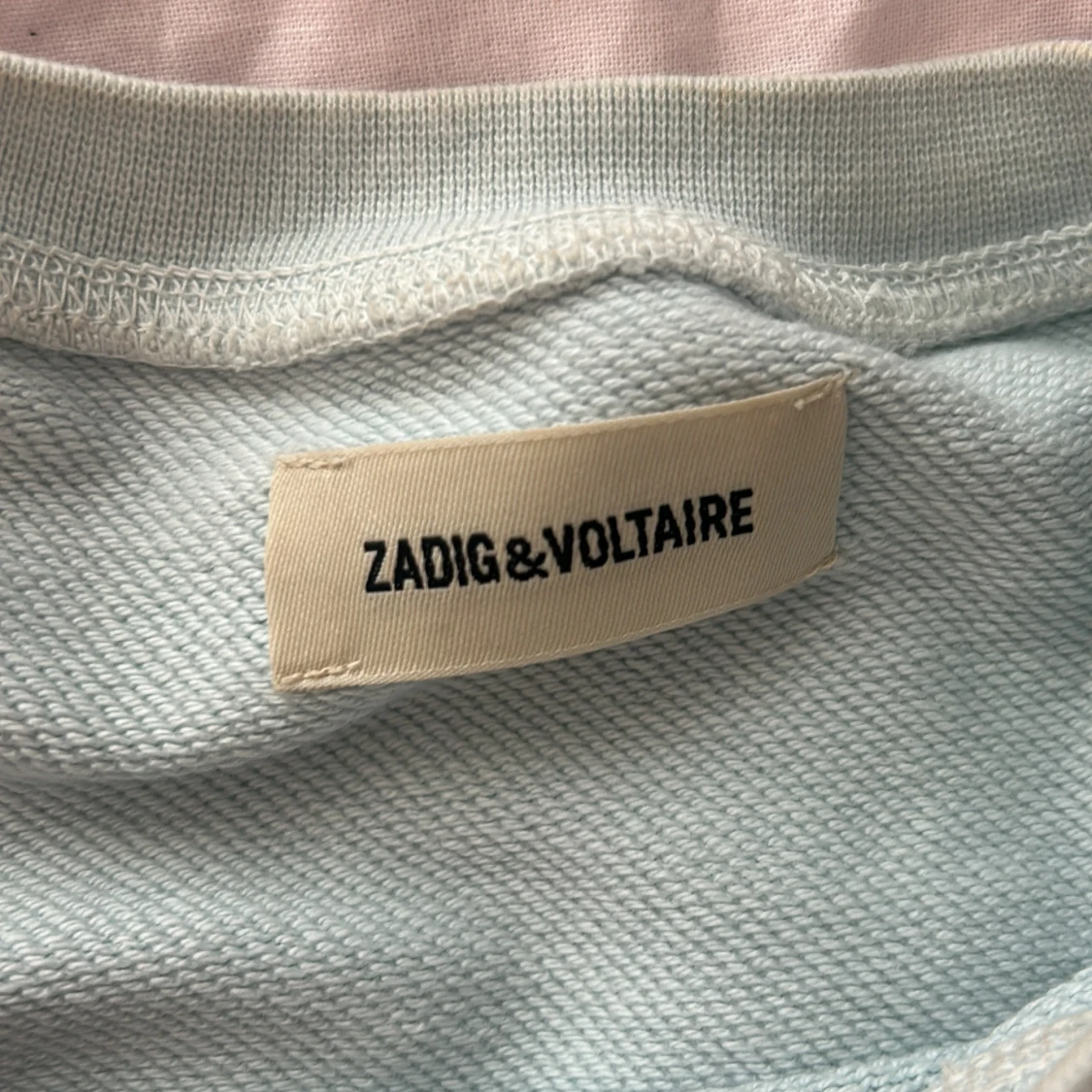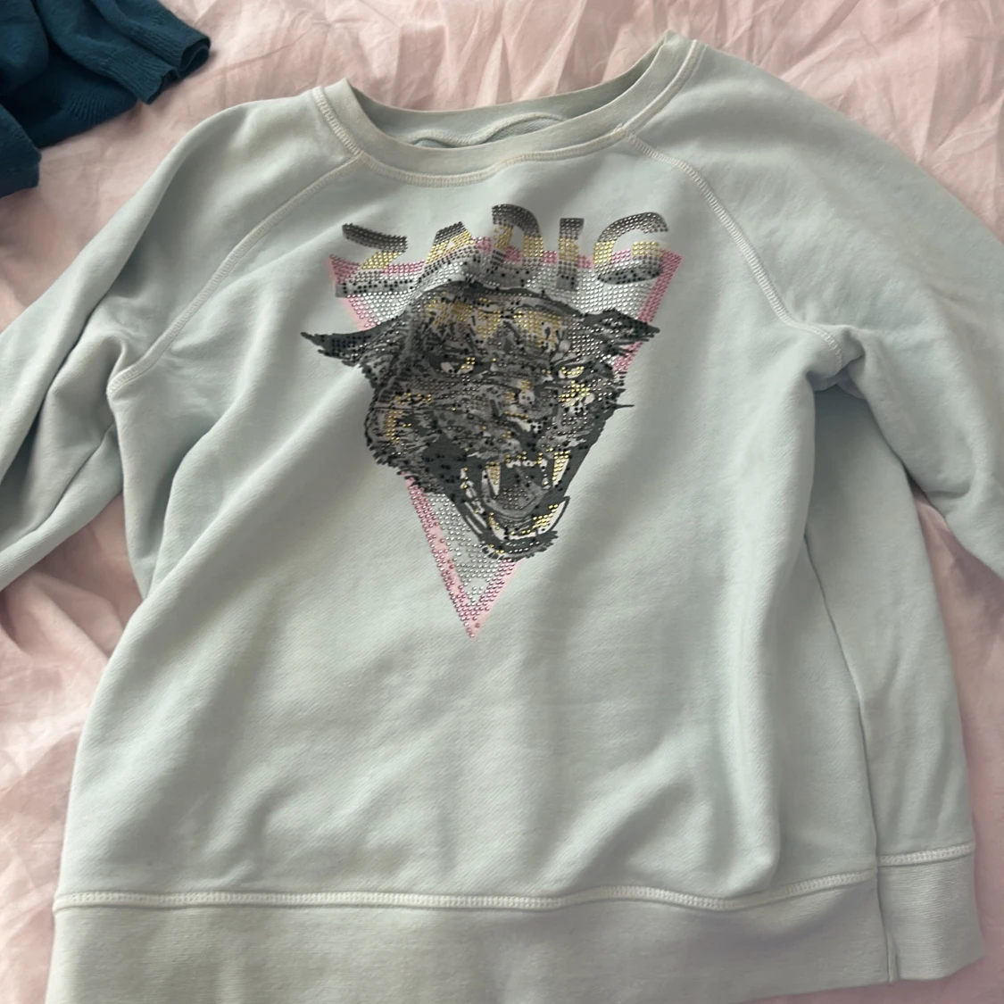 Säljer en supercool baby blå tröja från Zadig & Voltaire. Den har ett stort tryck av en panter på framsidan med texten 'ZADIG' ovanför. Tröjan är långärmad och gjord av bomull, vilket gör den både bekväm och stilren. Perfekt för höst och vår! 🐾