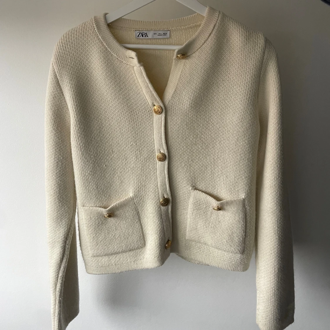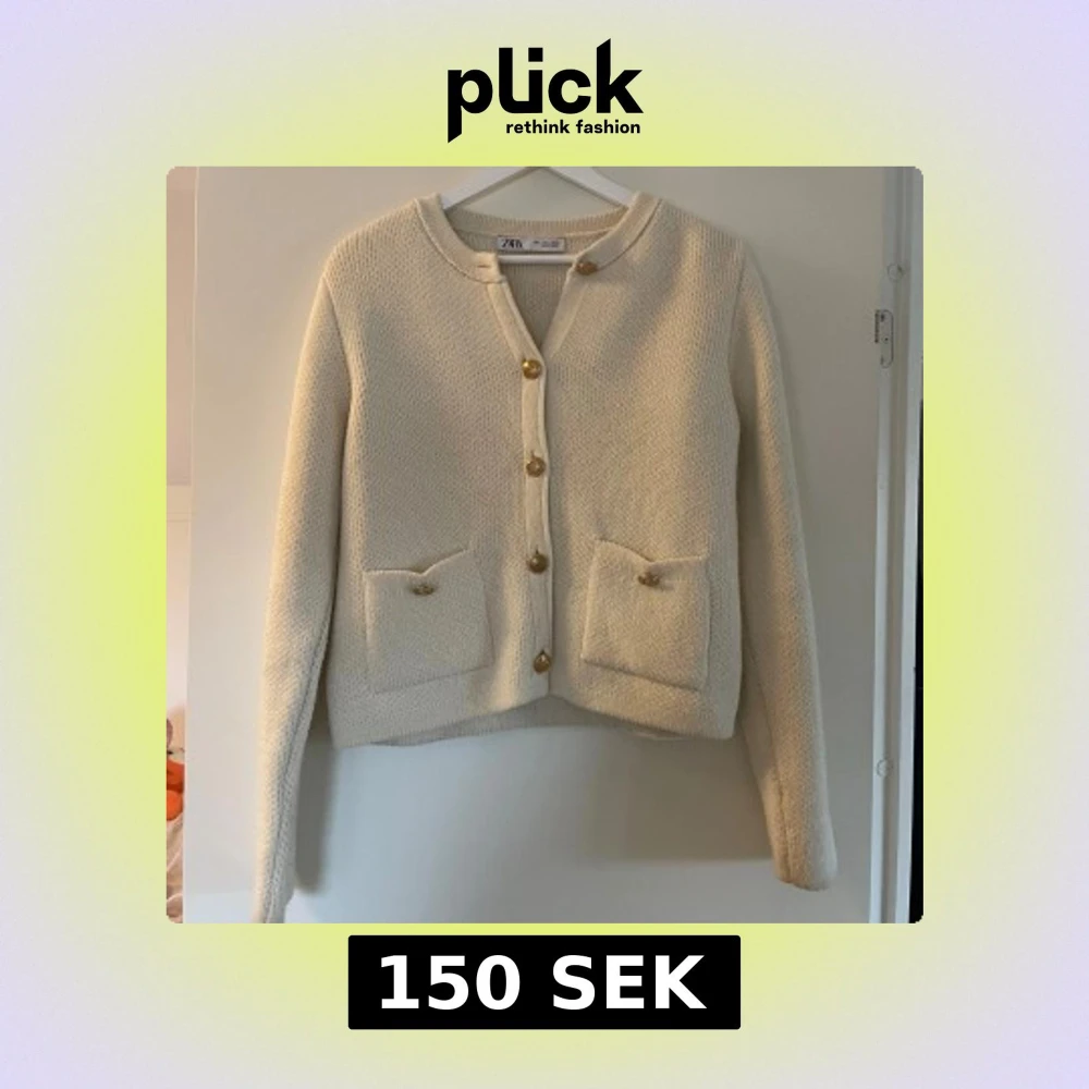 Superfin vit stickad kofta från Zara med guldiga knappar och två fickor framtill. Väldigt liten i storleken därför är den L men brukar vanligtvis ha S