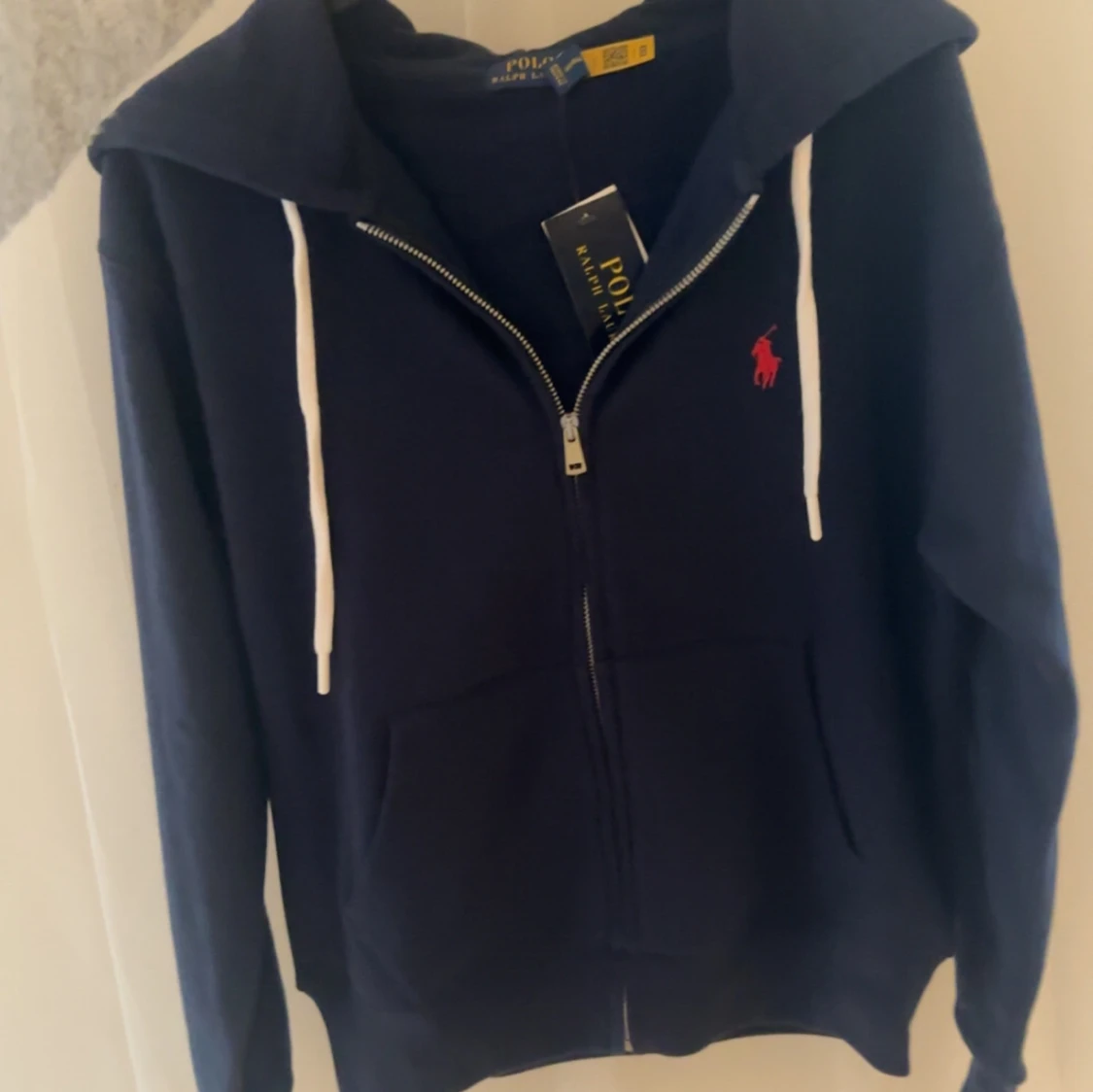 Säljer min snygga mörkblå helt nya hoodie från Ralph Lauren med dragkedja. Den har en liten röd logga på bröstet. Passar bra till jeans och leggings. Hör av dig vid intresse! Köpt för 2200