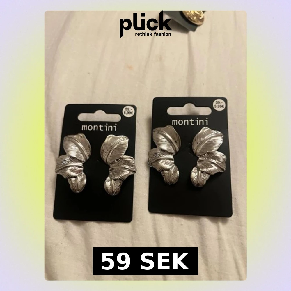 Säljer ett par silvriga örhängen från Montini med snygg bladformad design. Örhängena har en blank metallisk finish och är perfekta för dig som gillar statement-accessoarer. Säljs i originalförpackning. Säljer 1 för 59kr och 2 för 120kr