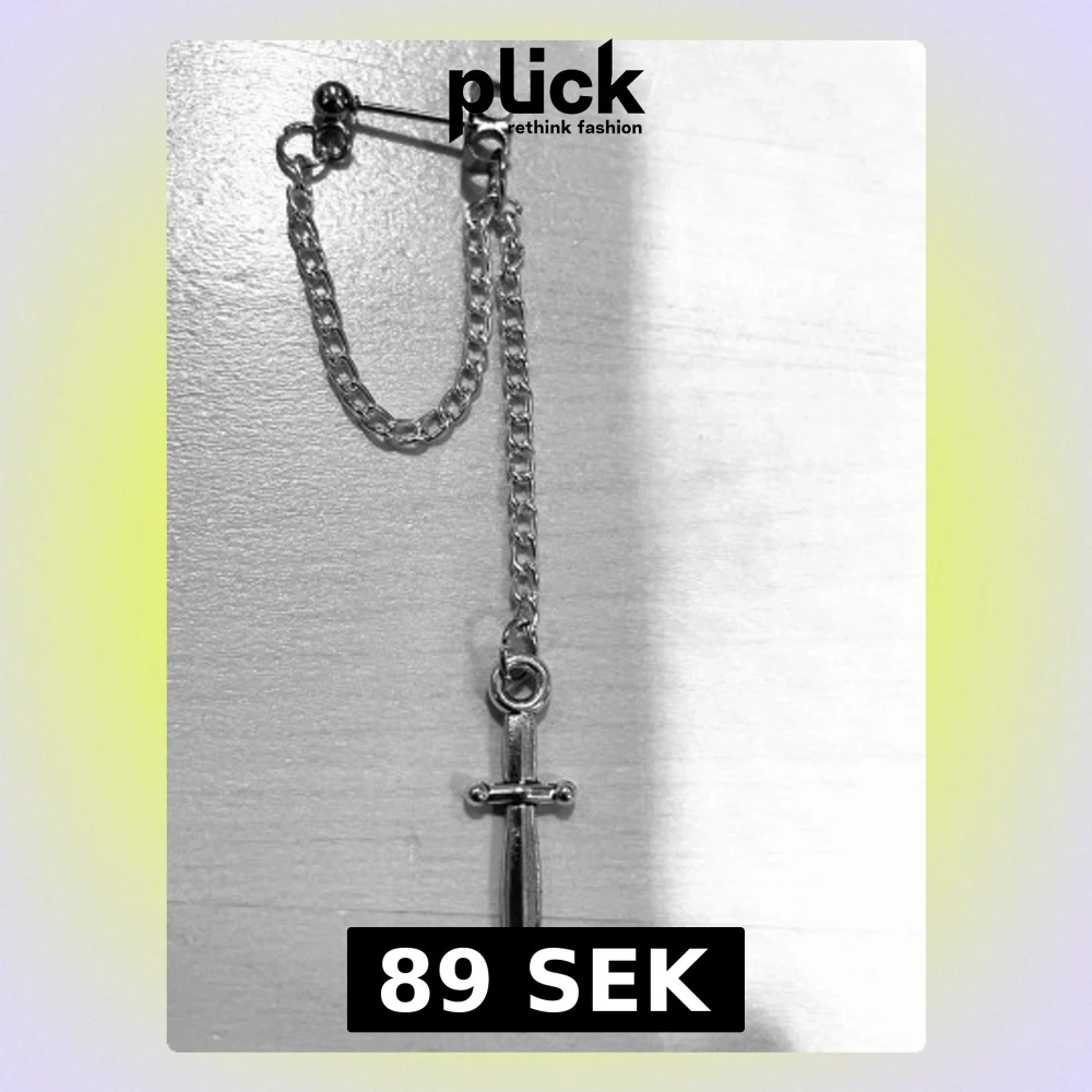 Coolt örhänge i silverfärg med kedja och ett hängande svärd. Kedjan ger en edgy vibe och svärdet som detalj gör det unikt. Perfekt för dig som vill sticka ut med din stil. Materialet är metall och designen är minimalistisk men ändå iögonfallande.