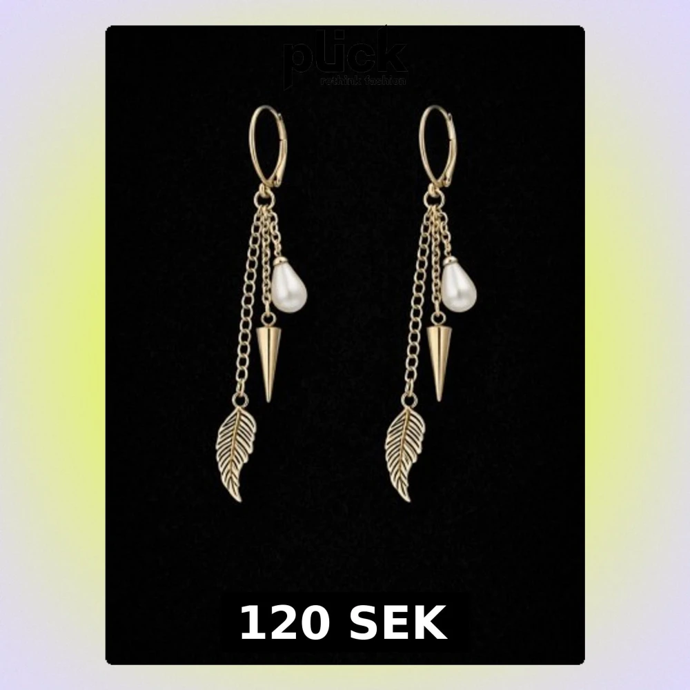Snygga guldiga örhängen med hängande kedjor, dekorativa löv, spetsiga hängen och vita pärlor. Perfekta för att ge din look en trendig och elegant touch. Passar dig som gillar unika accessoarer med lite edge.
