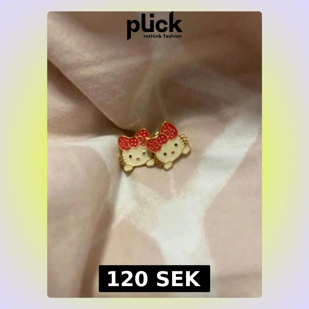Säljer ett par söta Hello Kitty örhängen i guldtonad metall med vit och röd emalj. Örhängena har motiv av Hello Kittys ansikte med en röd prickig rosett och små guldfärgade detaljer. Perfekta för dig som gillar kawaii-stil och vill ha något unikt i smyckessamlingen.