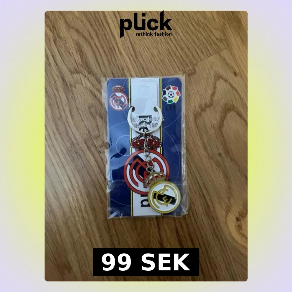 Nyckelring med Real Madrid-logga i metall och plast. Färgerna är vit, gul och svart med klubbens emblem. Perfekt accessoar för fotbollsfans som vill visa sitt stöd för laget.