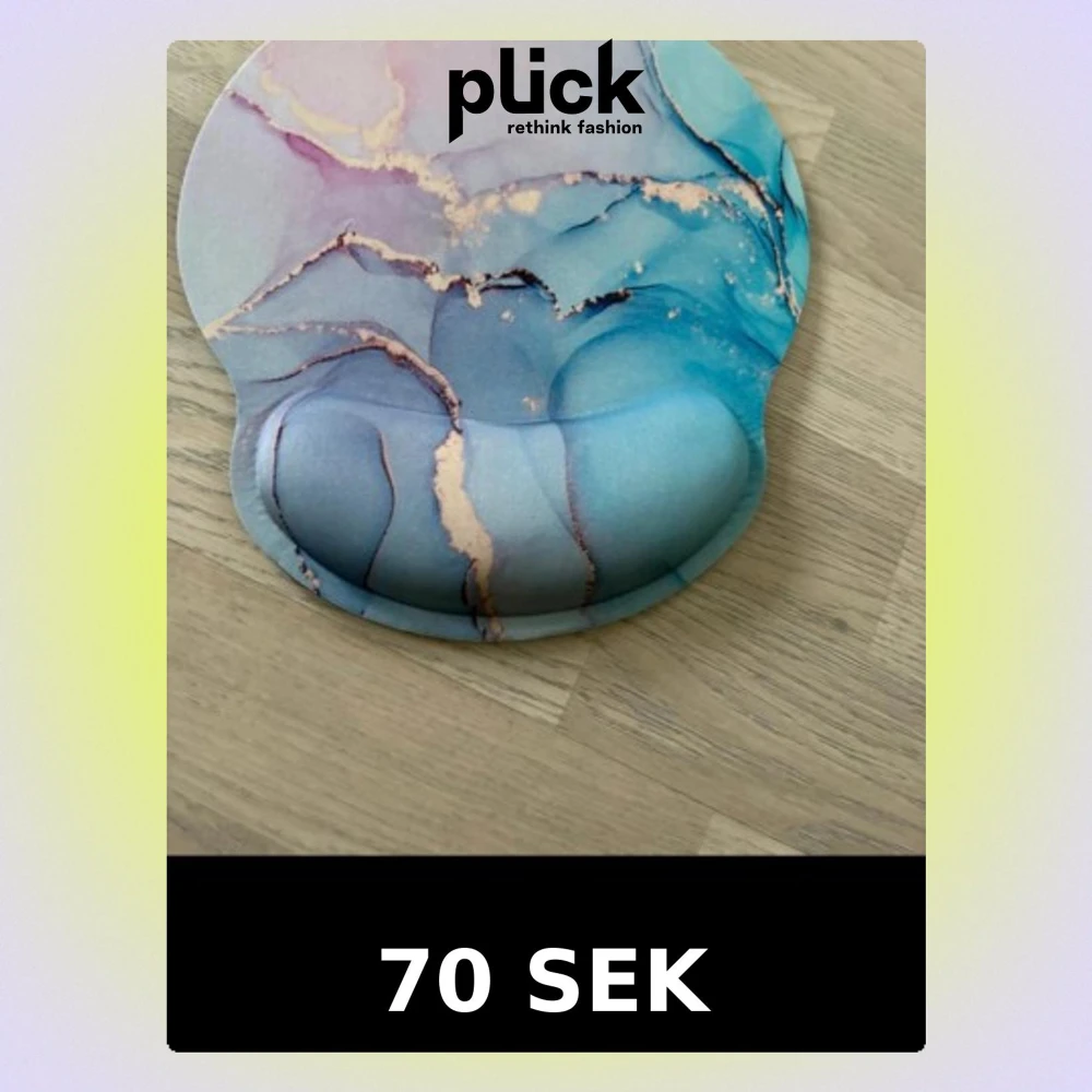 Snygg musmatta med handledsstöd i gel, dekorerad med ett färgglatt marmormönster i blått, rosa och guld. Ovansidan är slät och undersidan har en halkfri yta i svart tyg. Perfekt för dig som vill ha både komfort och stil vid datorn. Oanvänd
