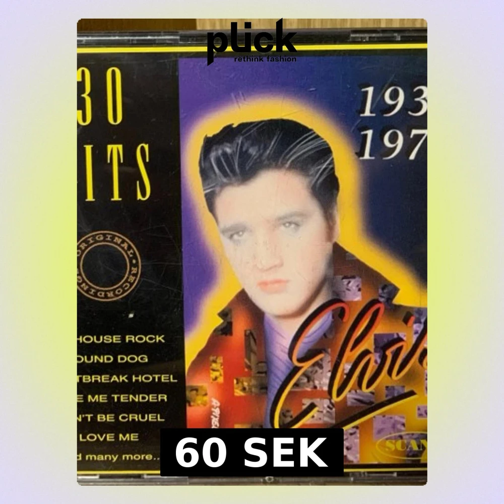 En CD-samling med 30 av Elvis Presleys största hits från 1935-1977. Omslaget har färgstark design med Elvis signatur och låtlista på baksidan. Perfekt för dig som gillar klassisk rock'n'roll och samlar på musikrelaterade böcker och övrigt.