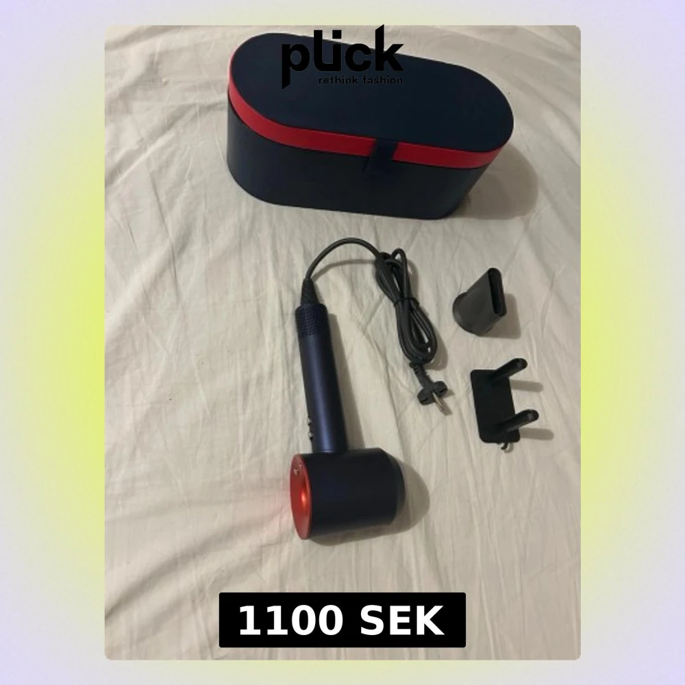 Blå och röd dyson hårfön. Helt ny, ej använd. Kommer med tillbehören på bilden samt lådan i bilderna