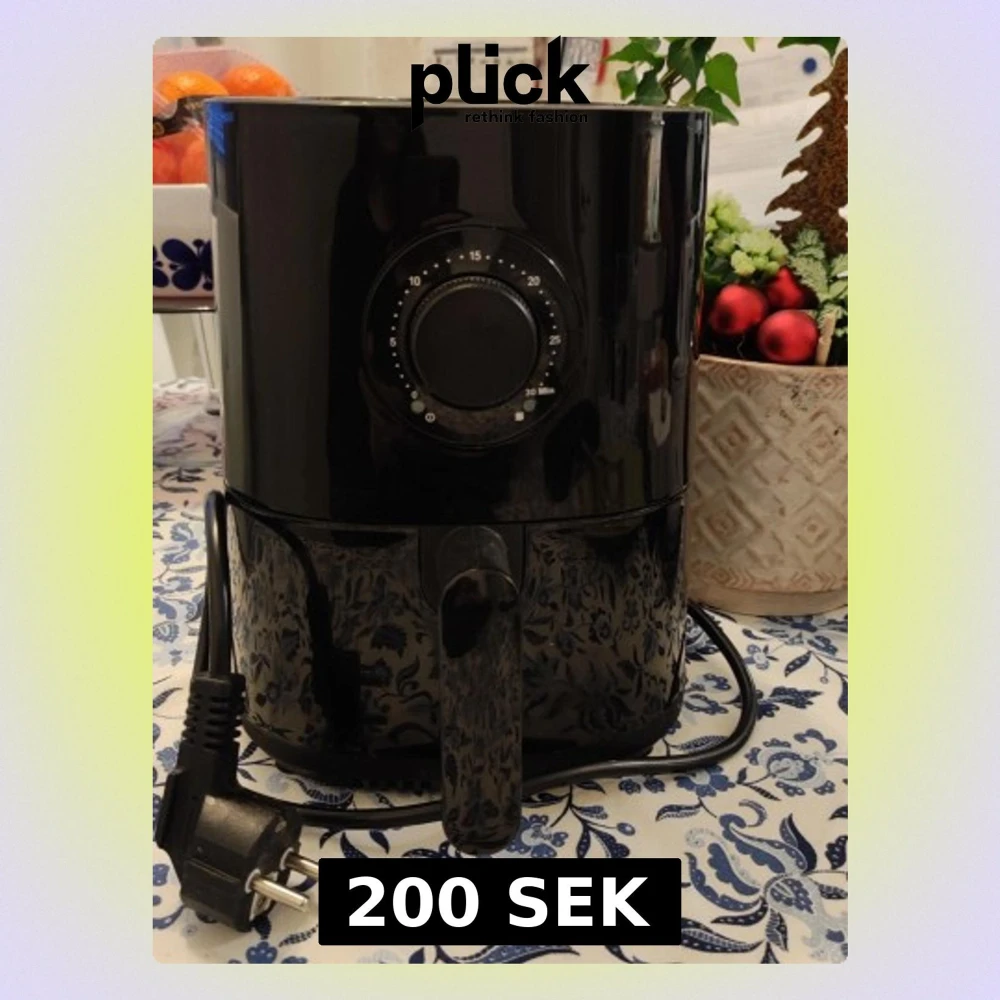 Säljer en svart airfryer från Menuett med rund form och slät yta i plast. Den har en stor vred på framsidan för att ställa in tid upp till 30 minuter och en praktisk utdragbar korg. Perfekt för att laga mat utan olja och enkel att använda med vanlig stickkontakt.